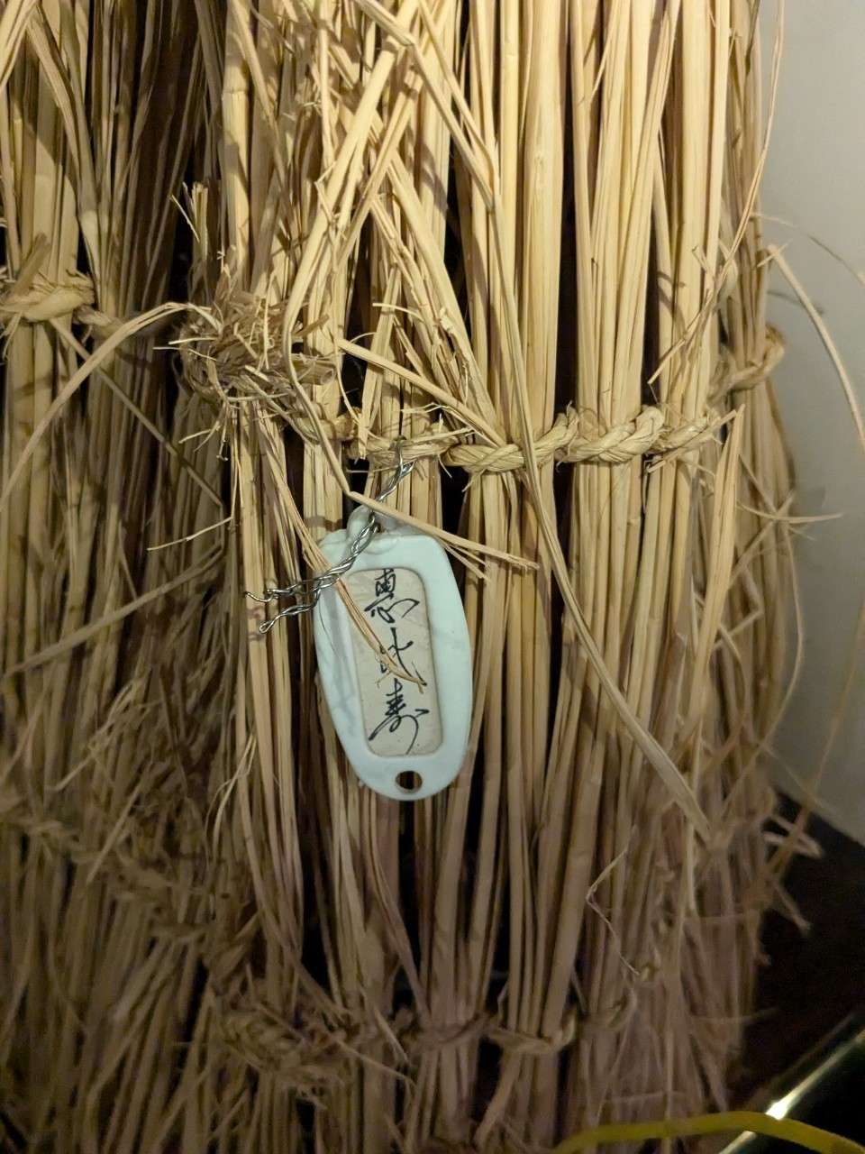 赤須賀の献石俵は繰り返し使うため、町名タグが付いています。