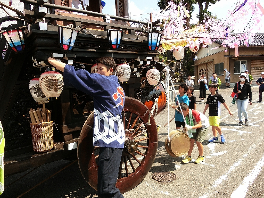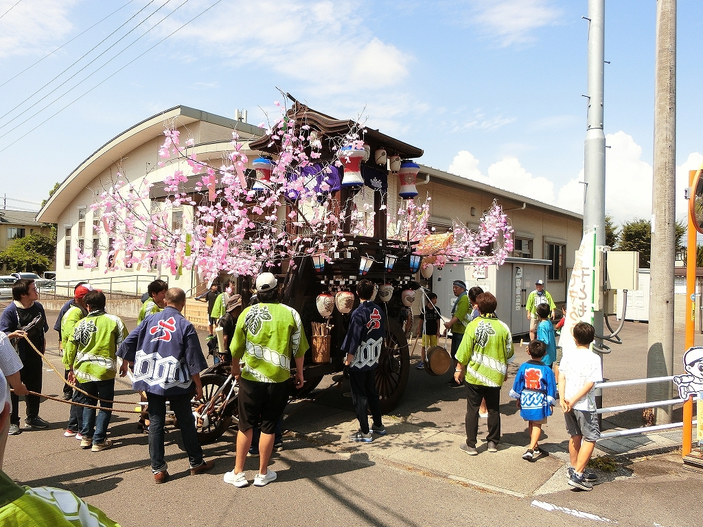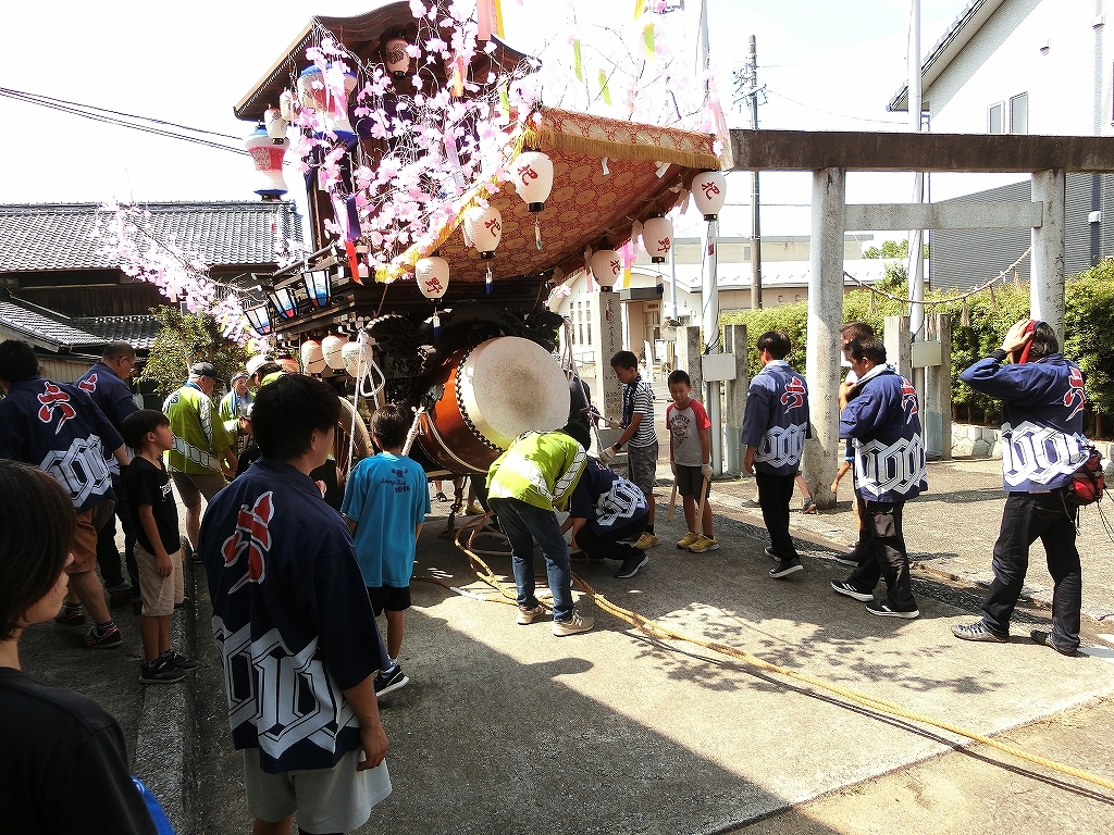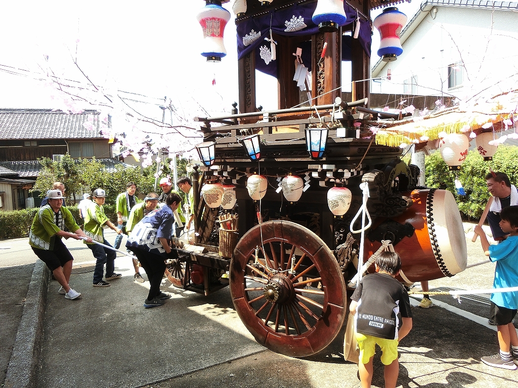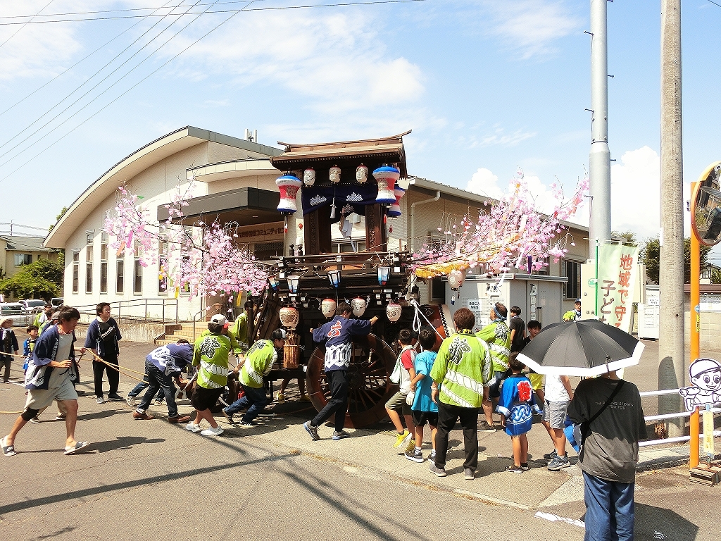 囃子を一時止めて、地区の方々が祭車を方向転換します。
