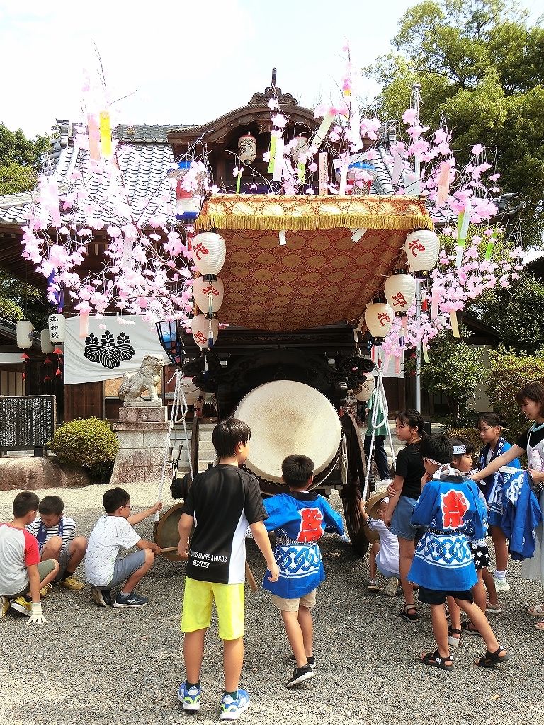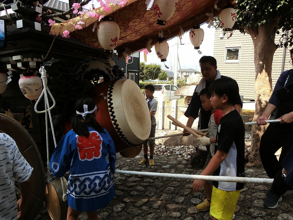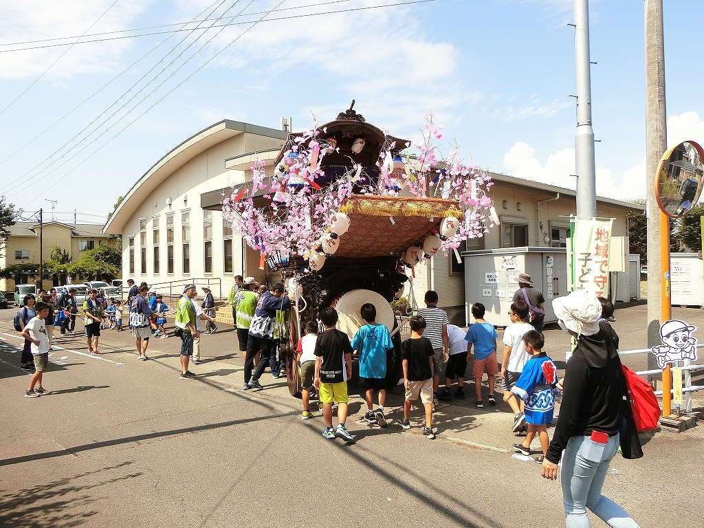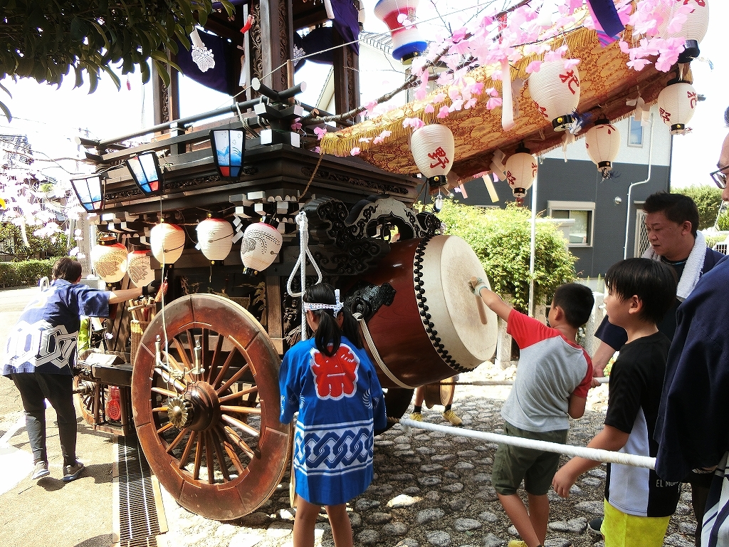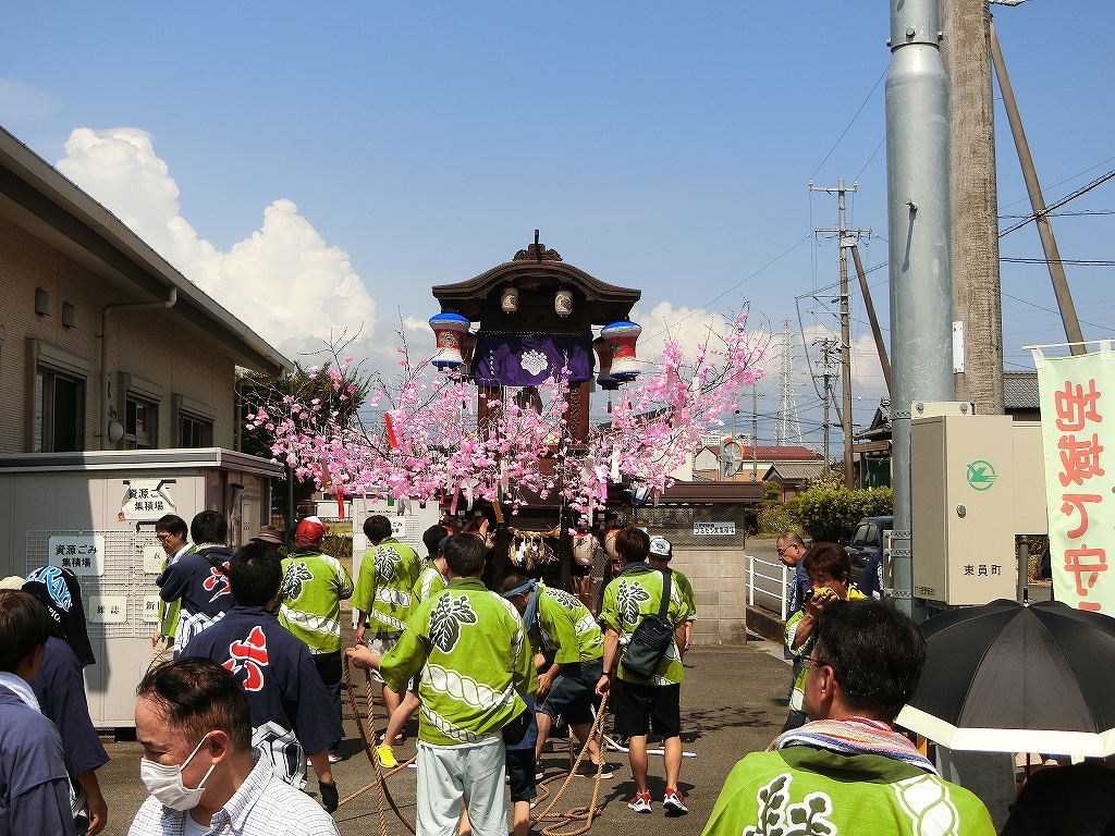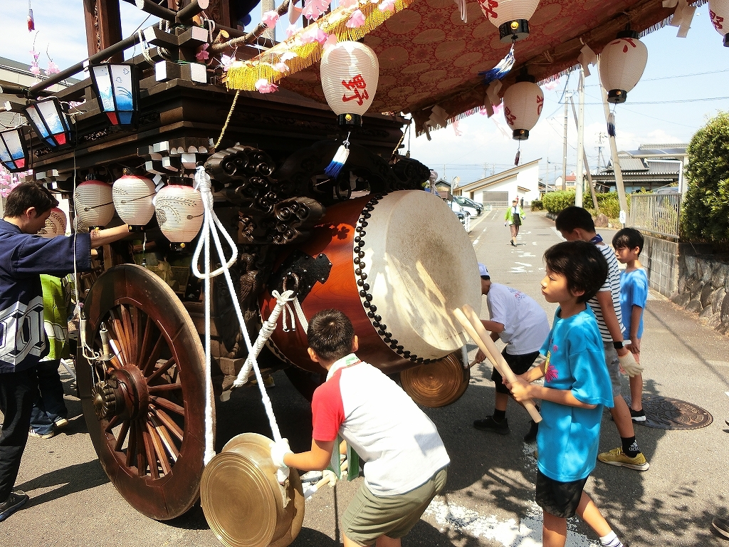 囃子を一時止めて、地区の方々が祭車を方向転換します。