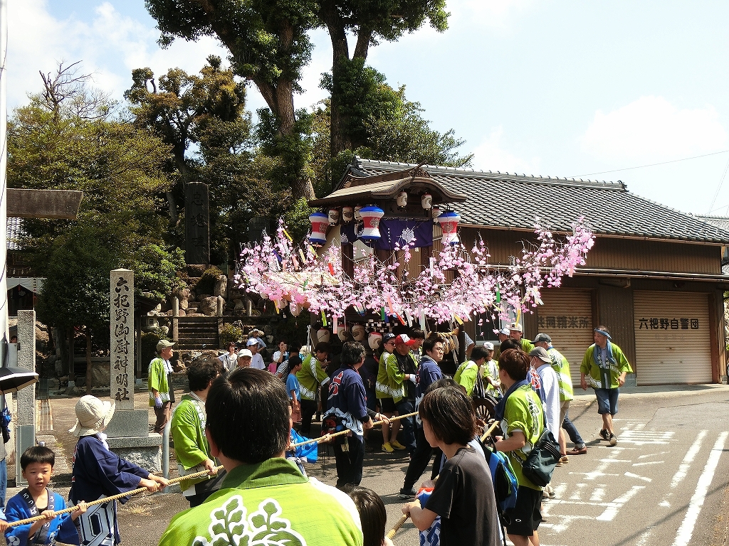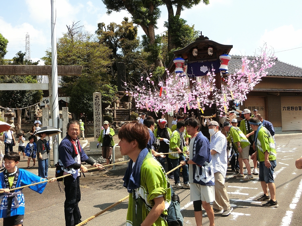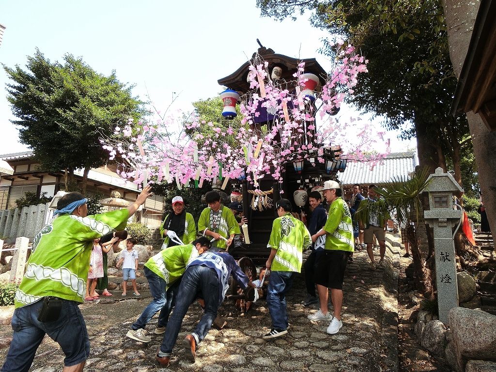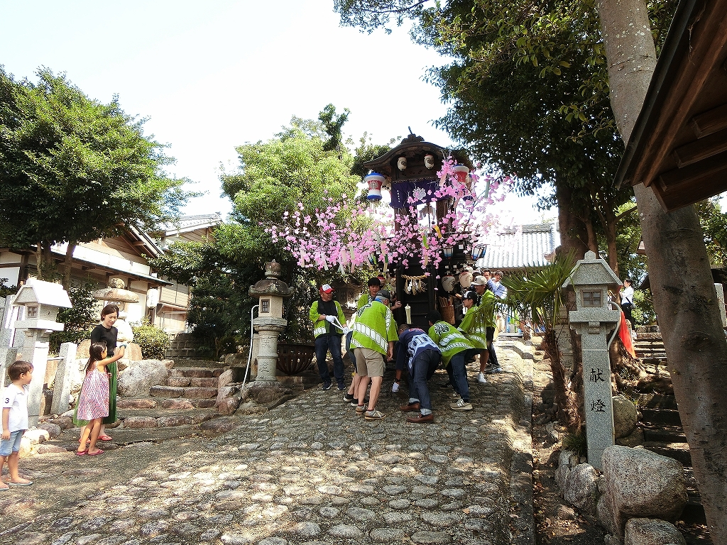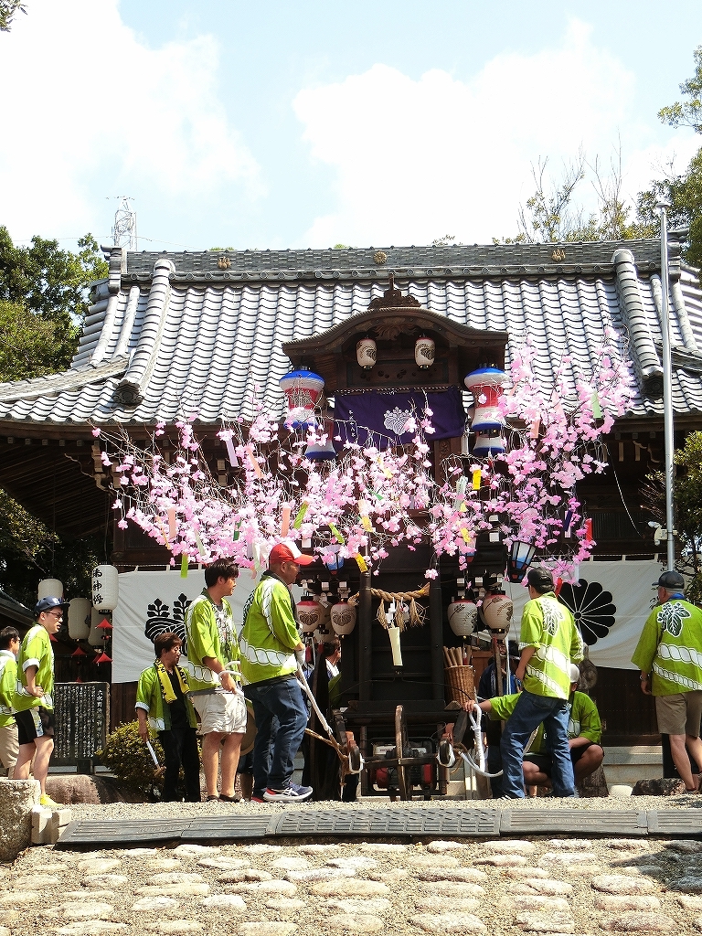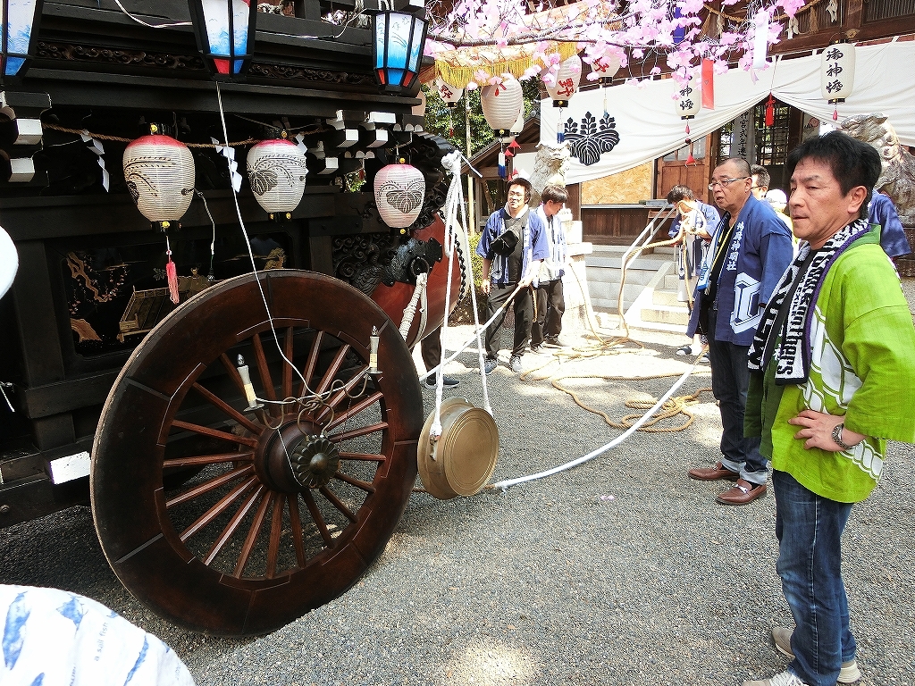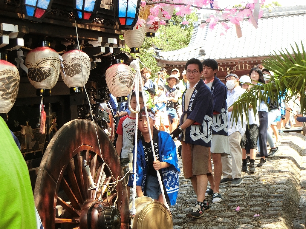 小高い坂の上にある境内から、祭車を曳き下ろします。