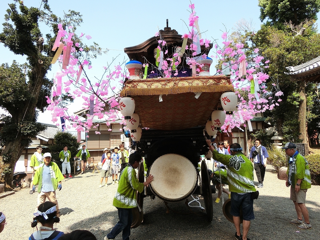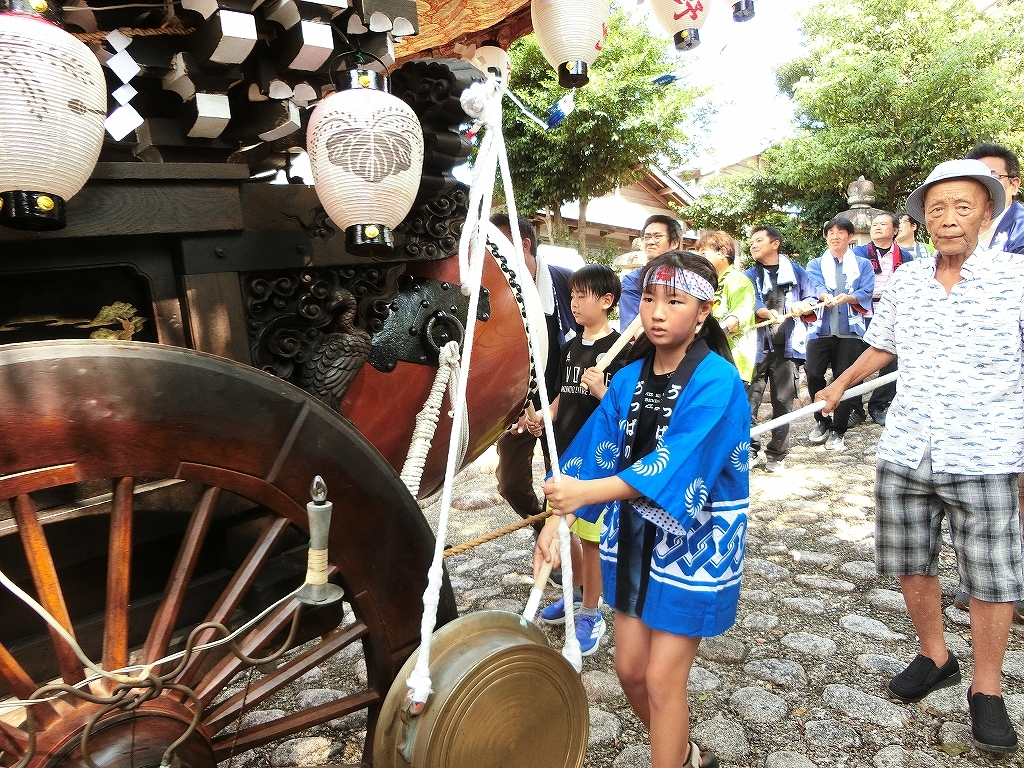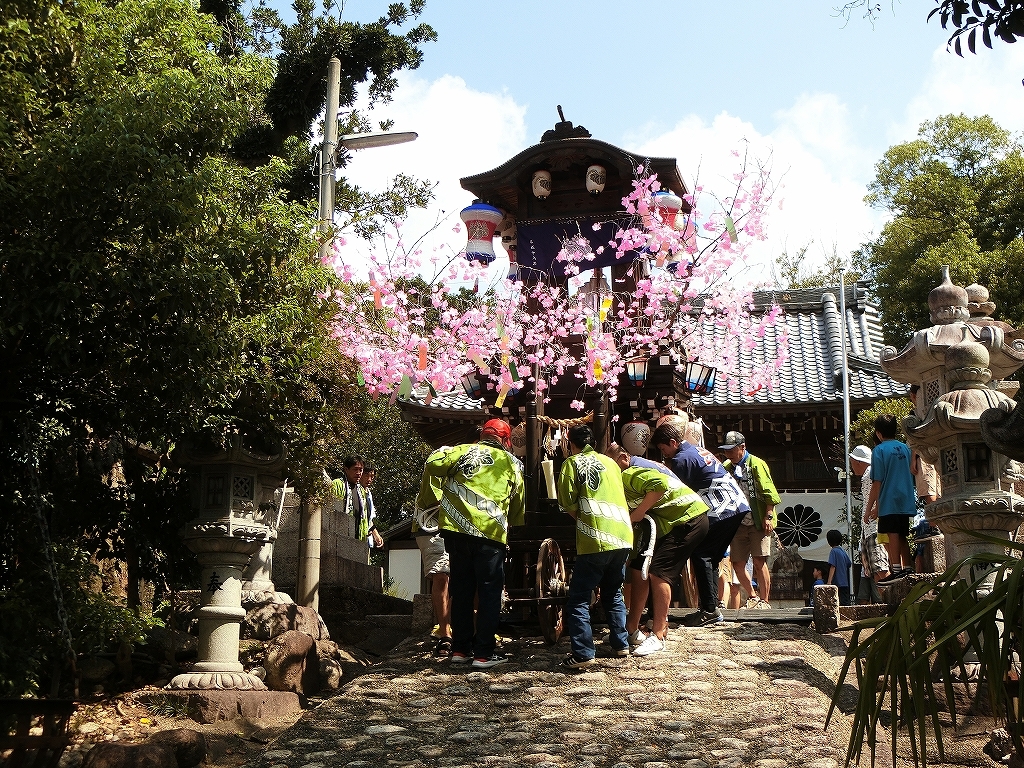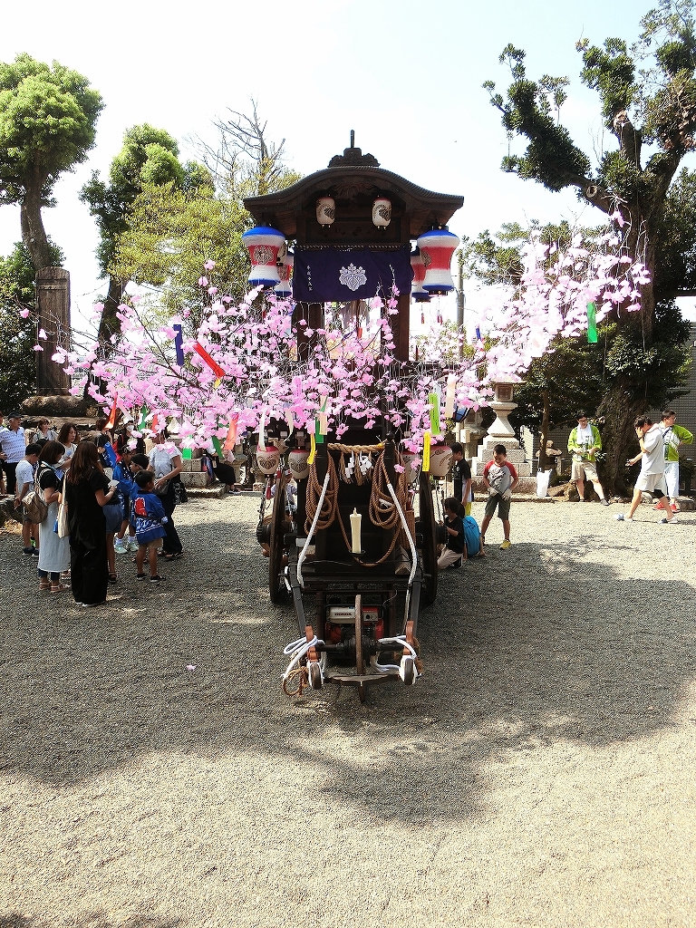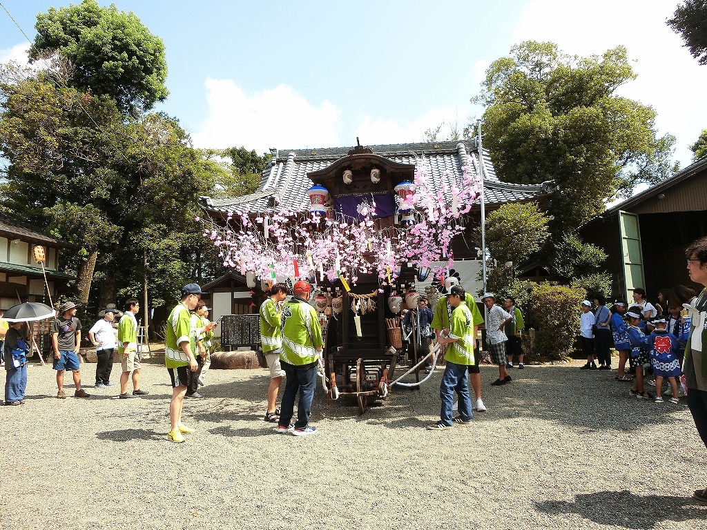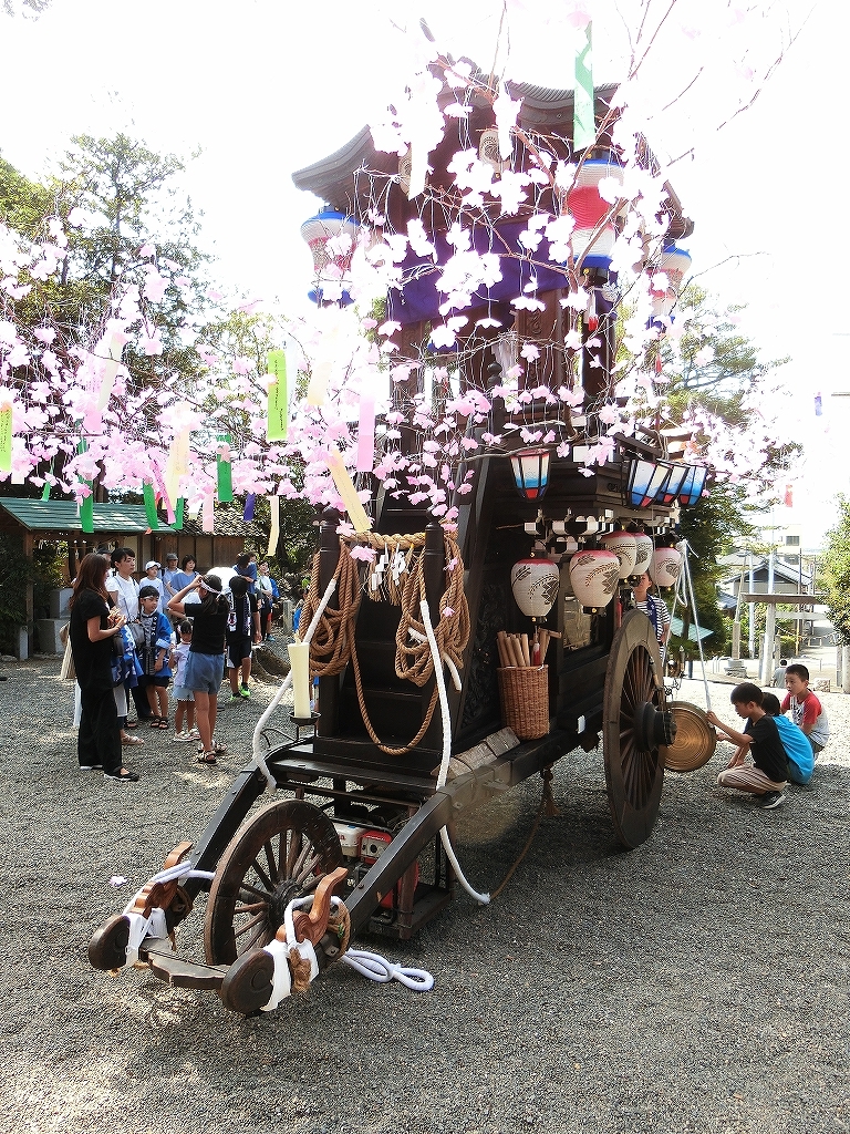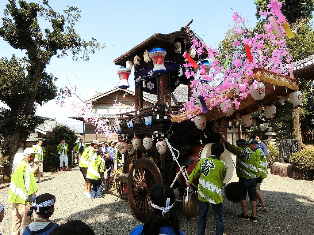 小高い坂の上にある境内から、祭車を曳き下ろします。