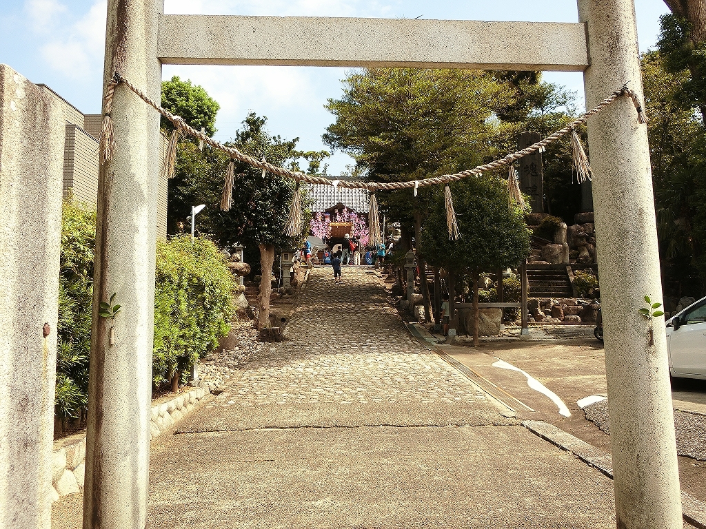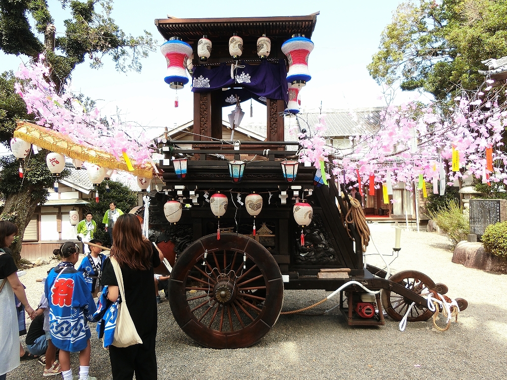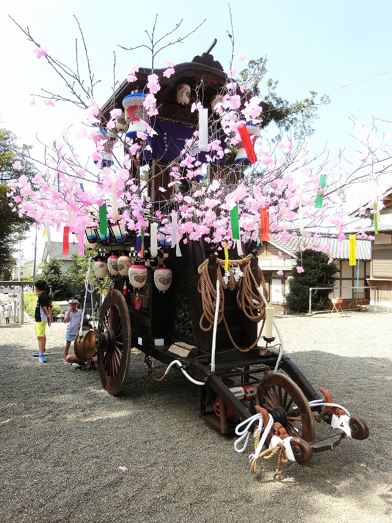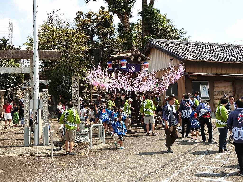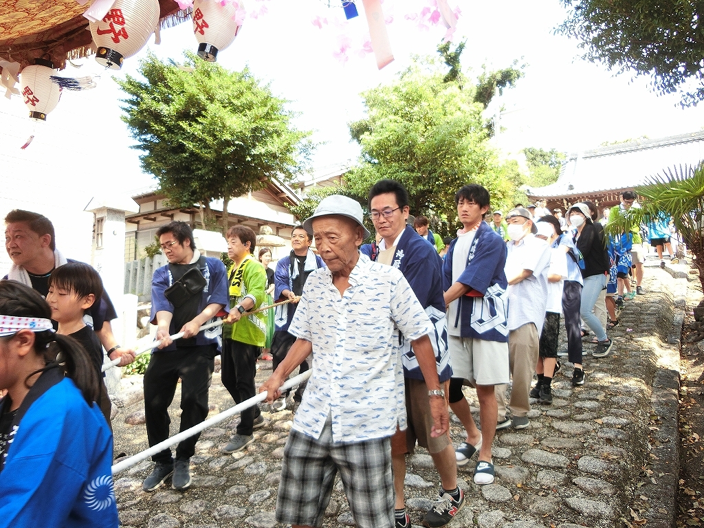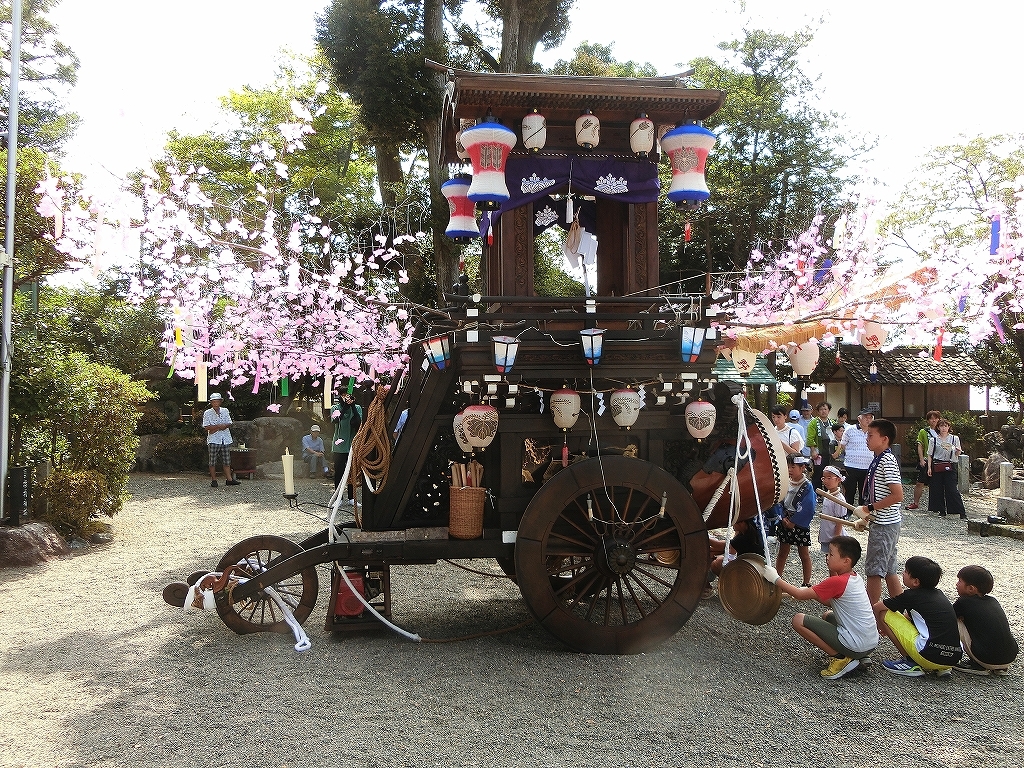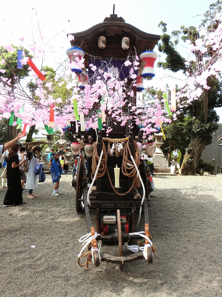 小高い坂の上にある境内から、祭車を曳き下ろします。