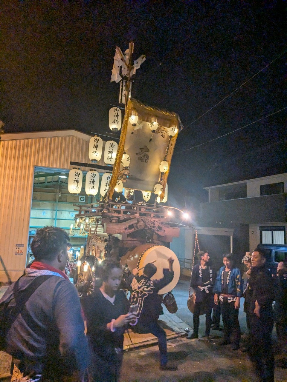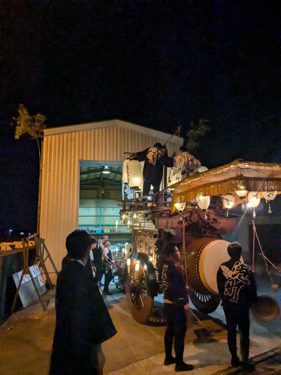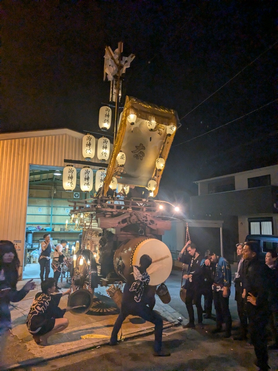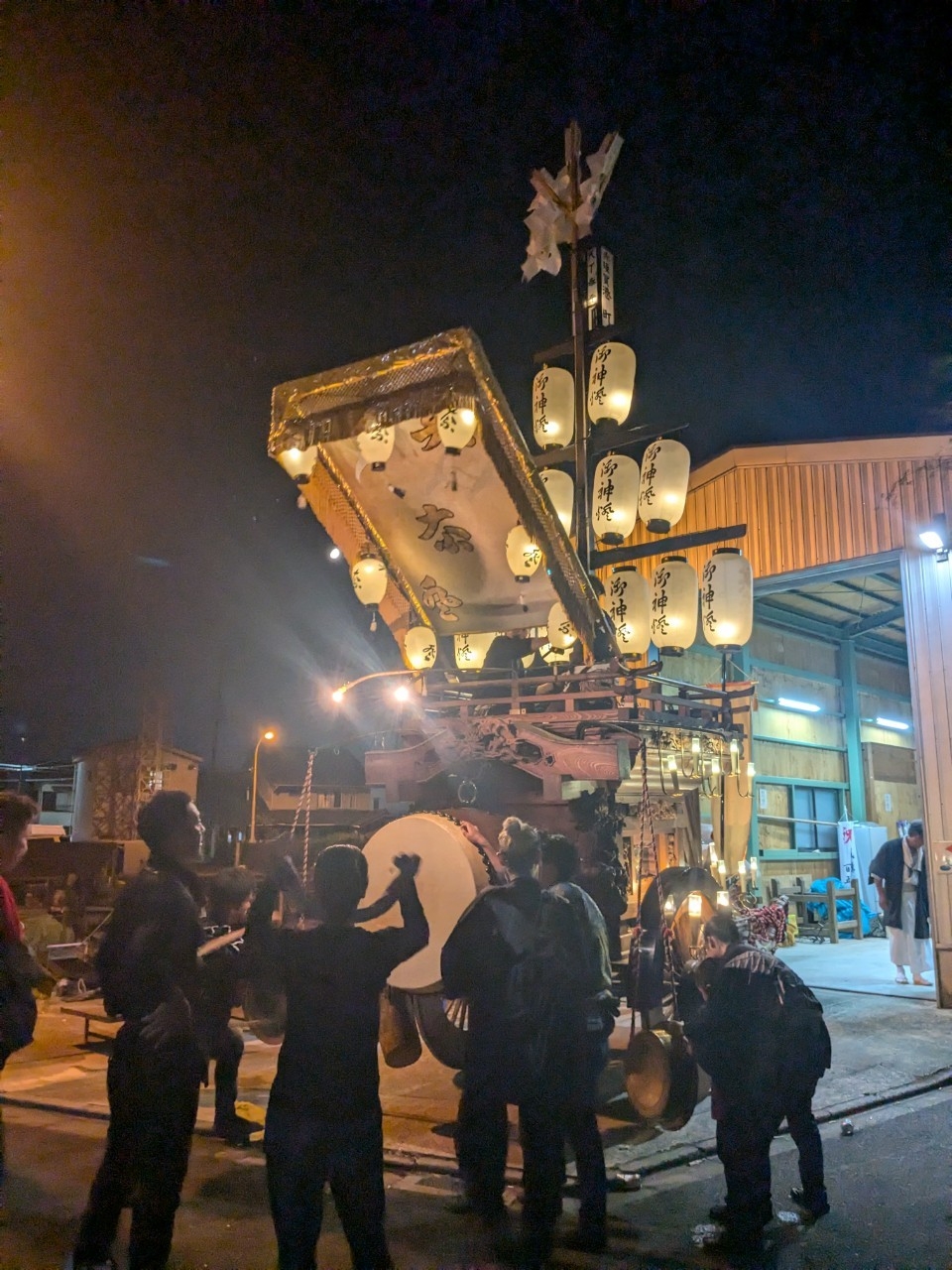 祭車庫前で叩きます。