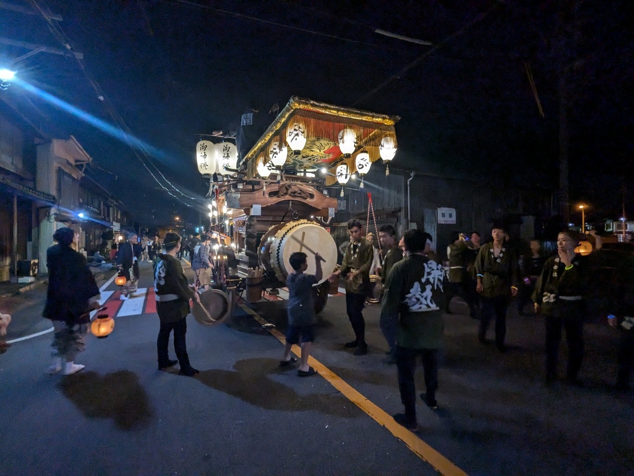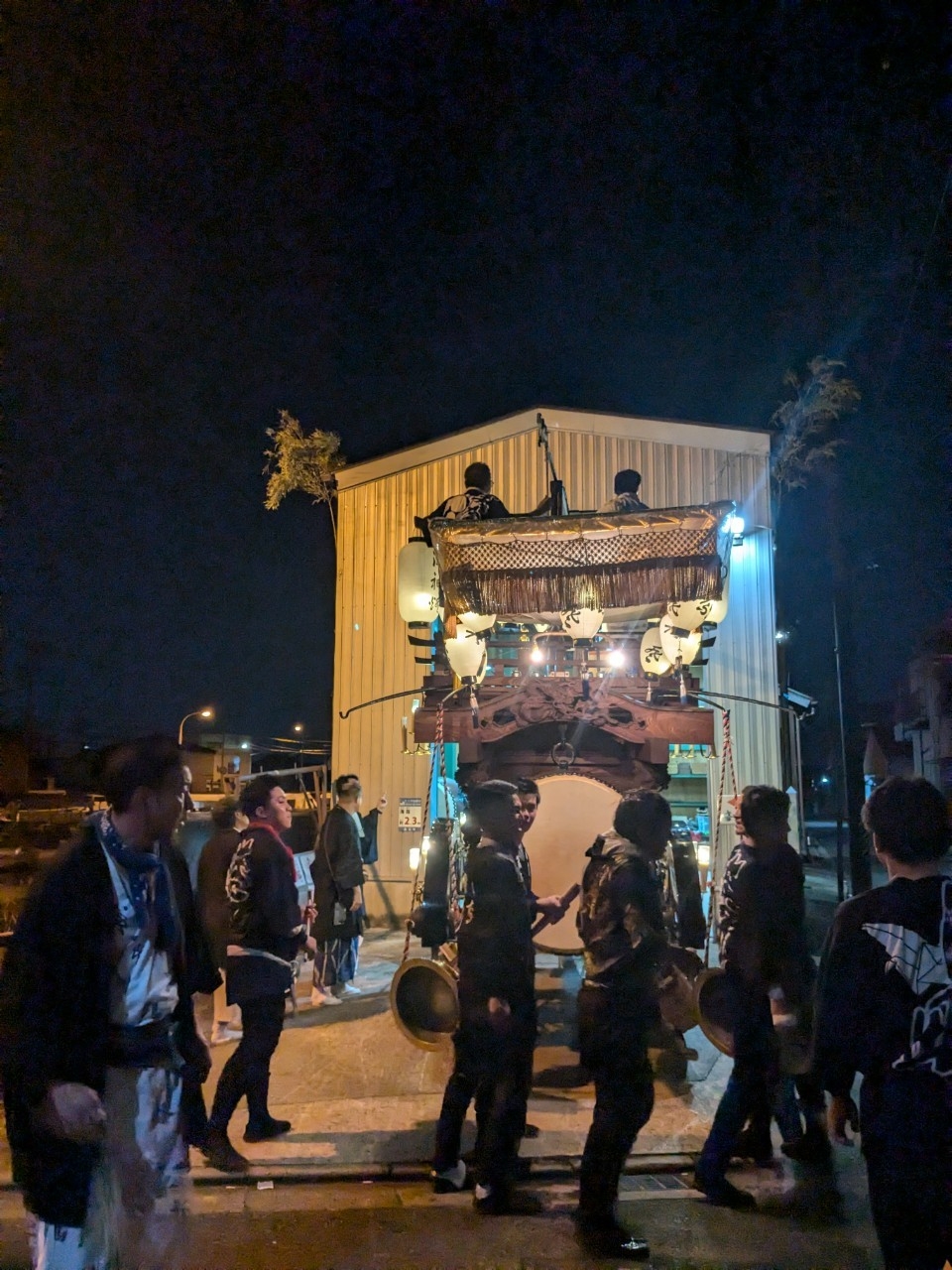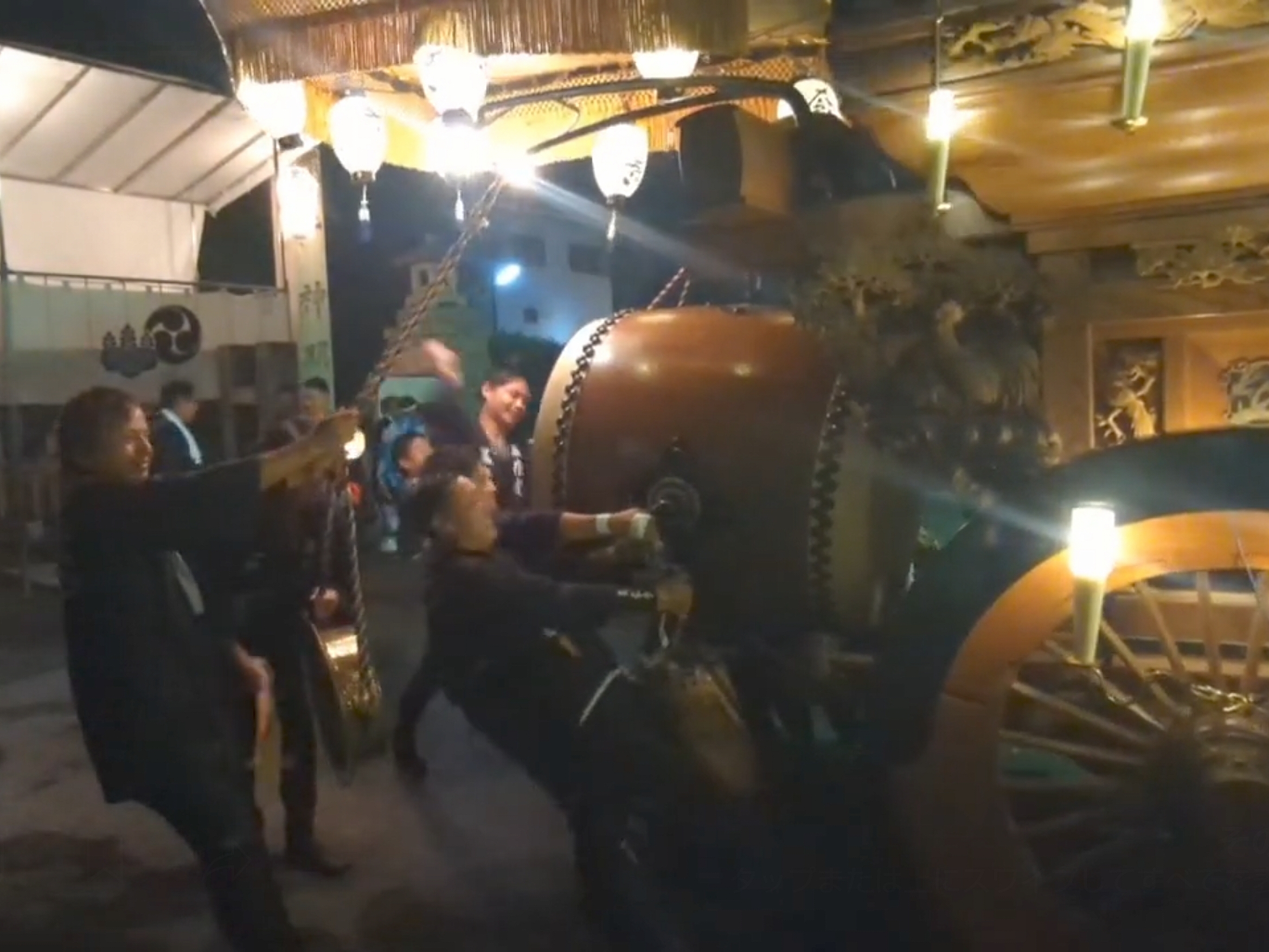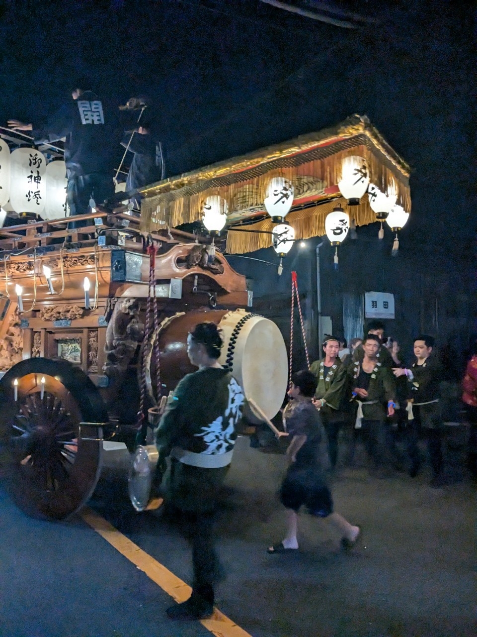祭車庫前で叩きます。