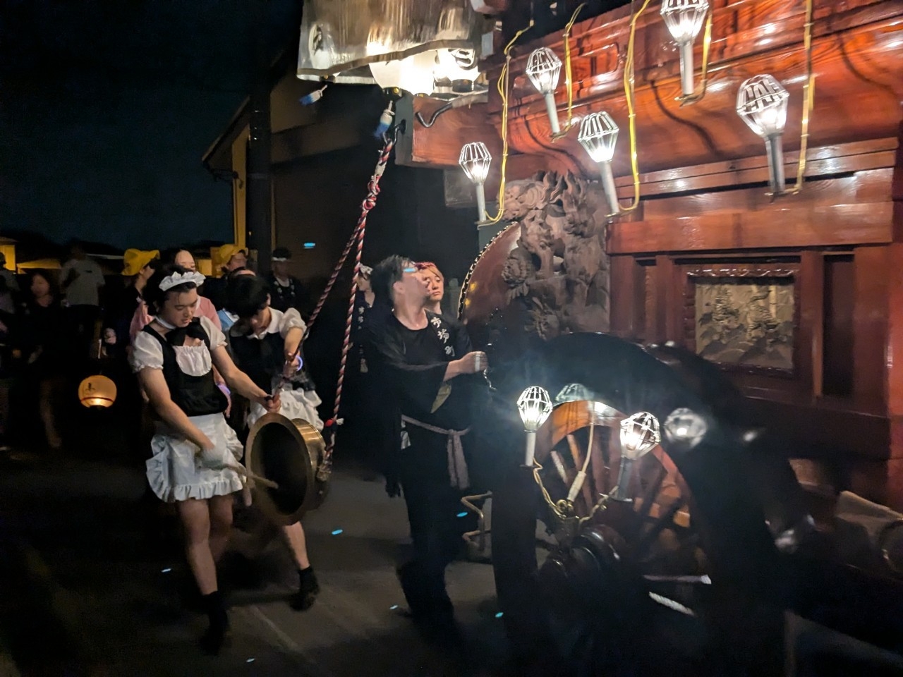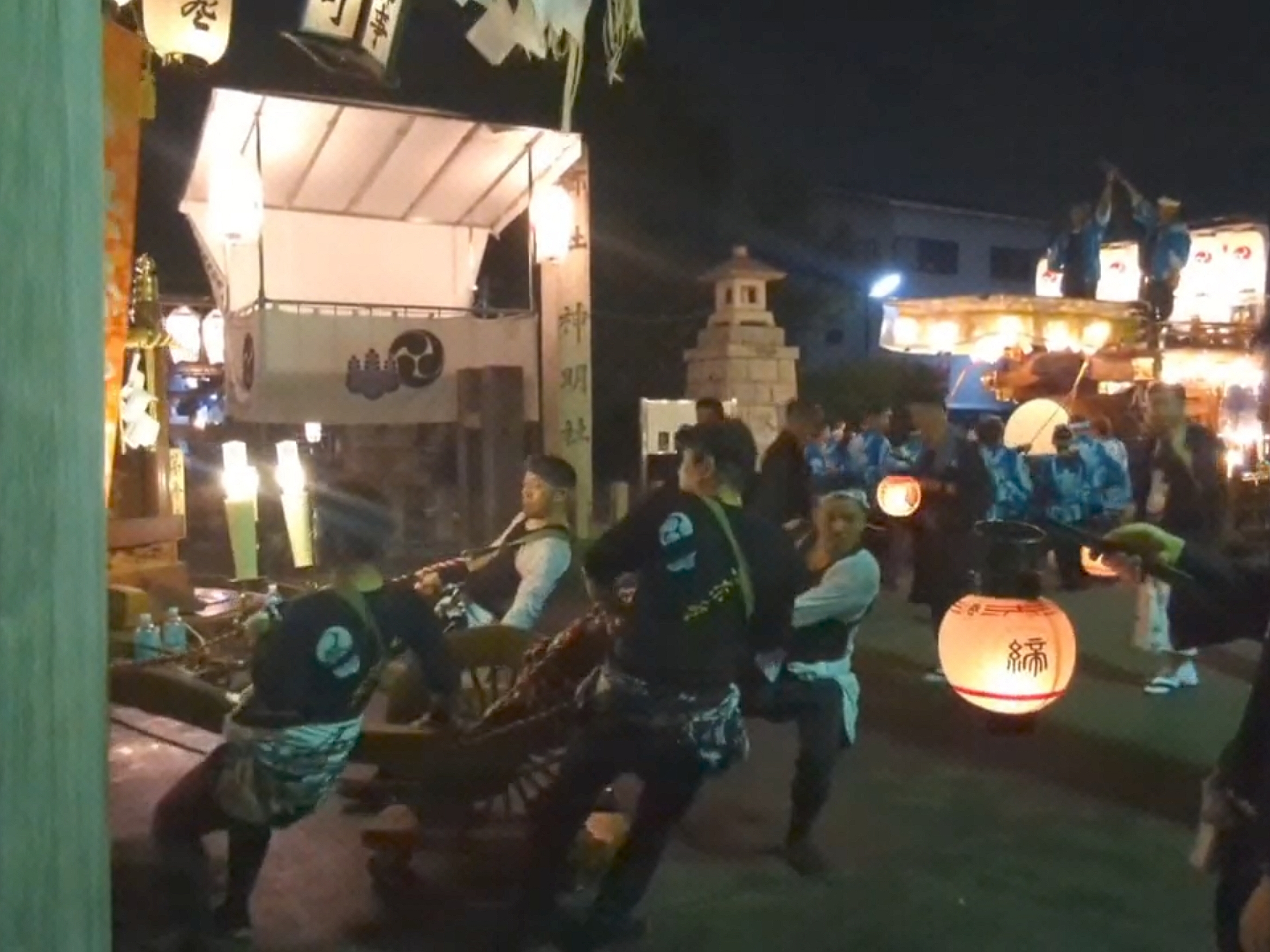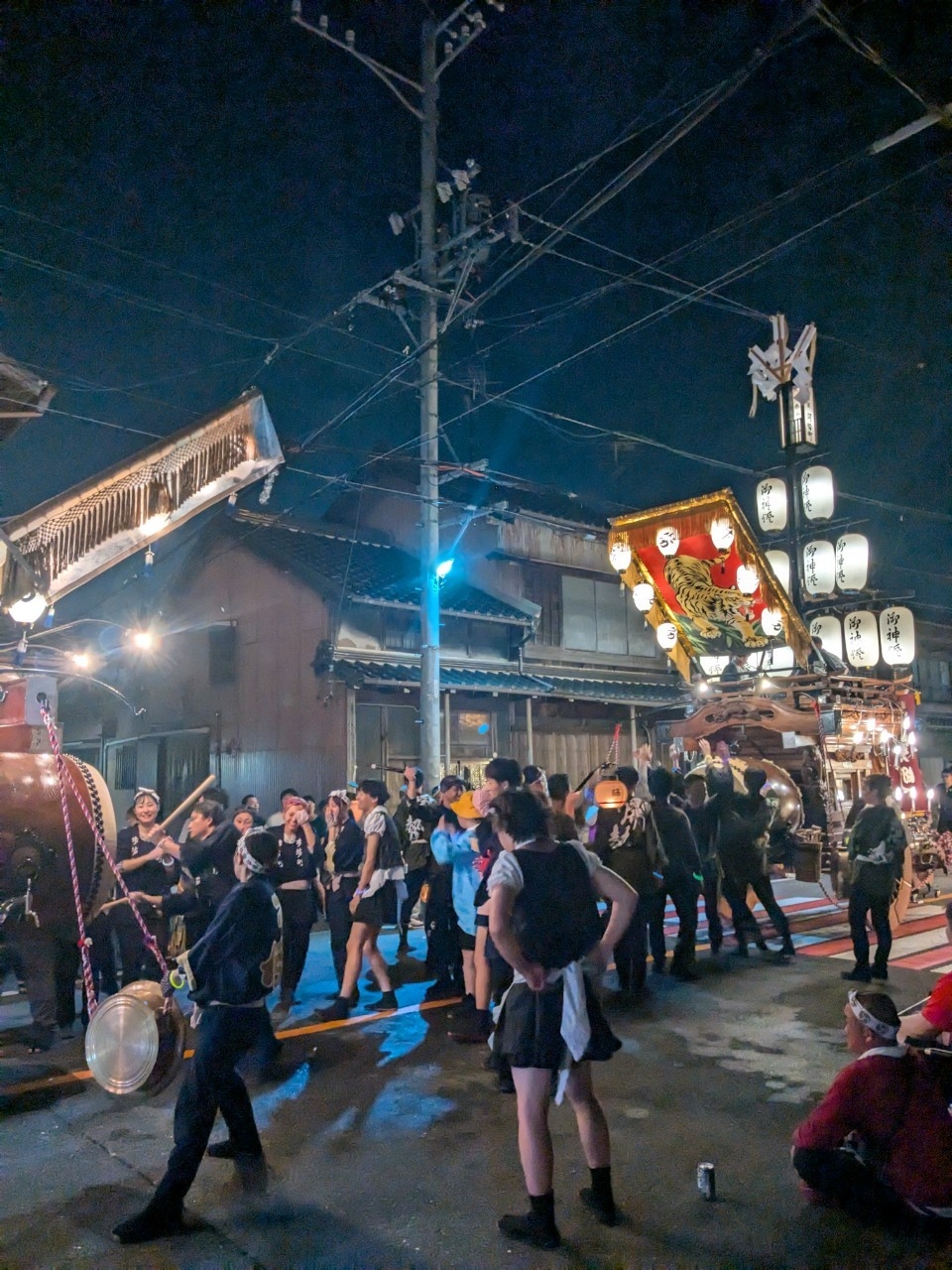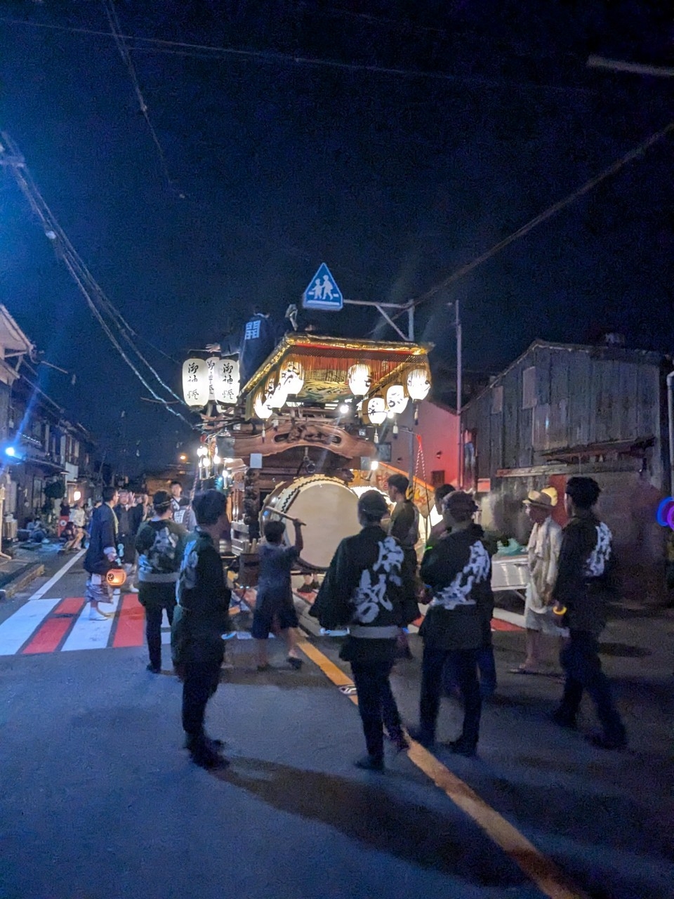 祭車庫前で叩きます。