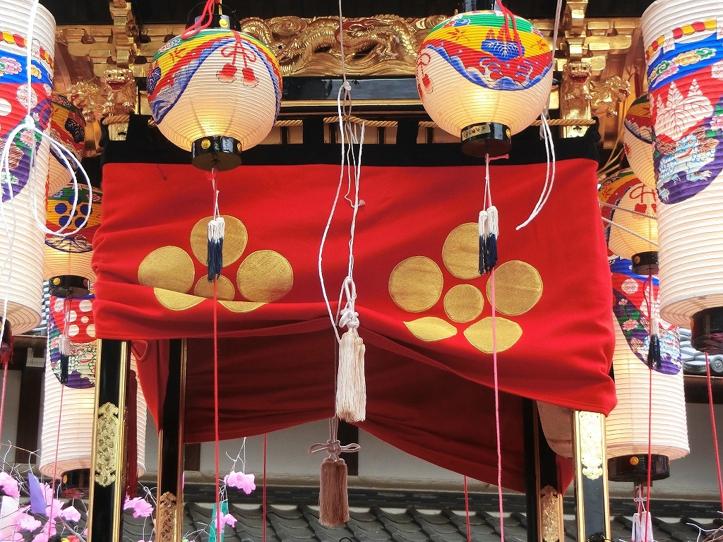 屋形水引幕は赤地に梅鉢紋の金刺繍です。