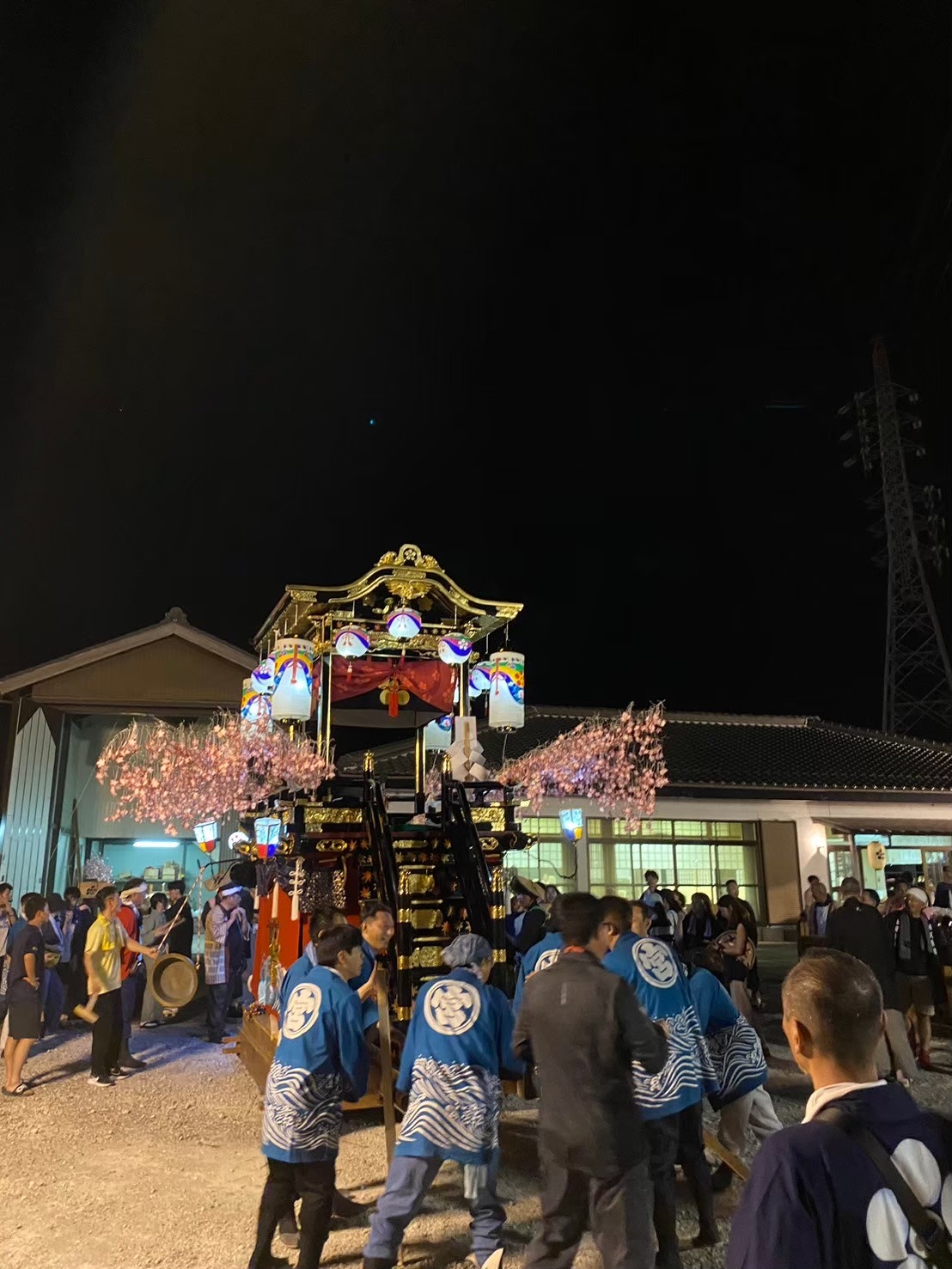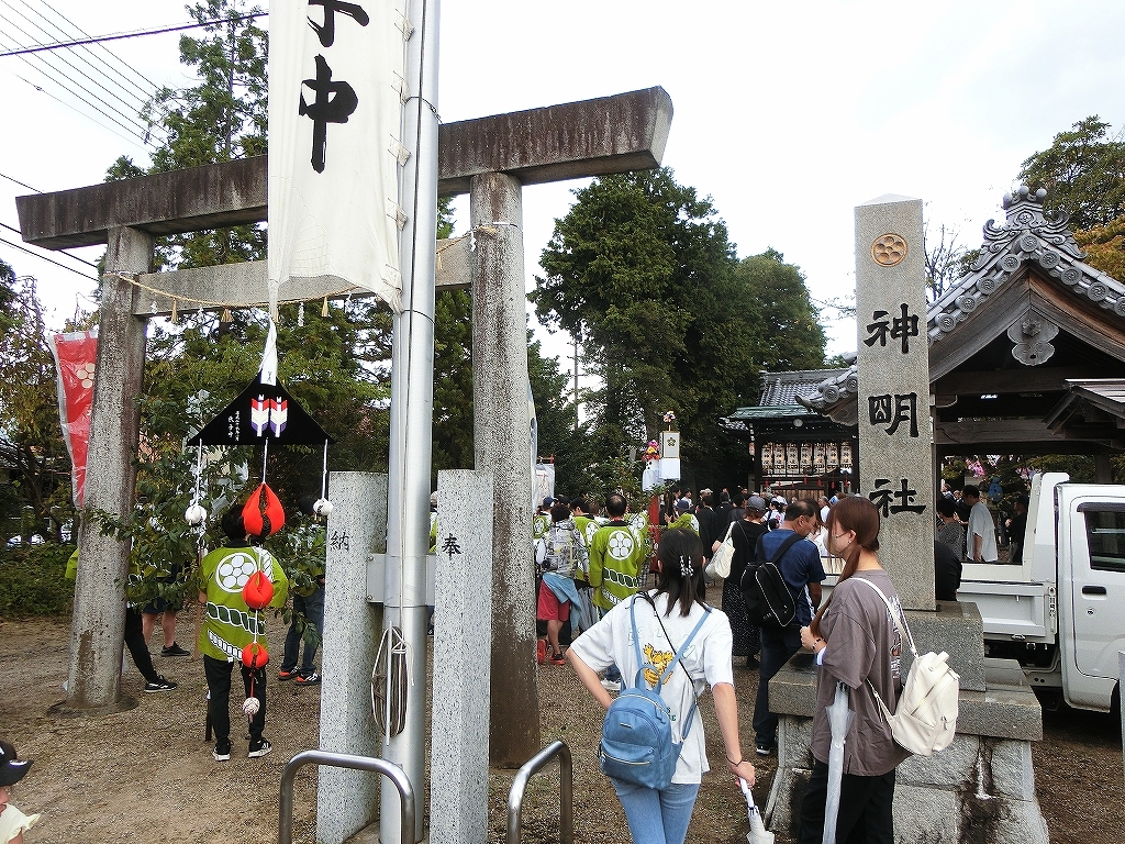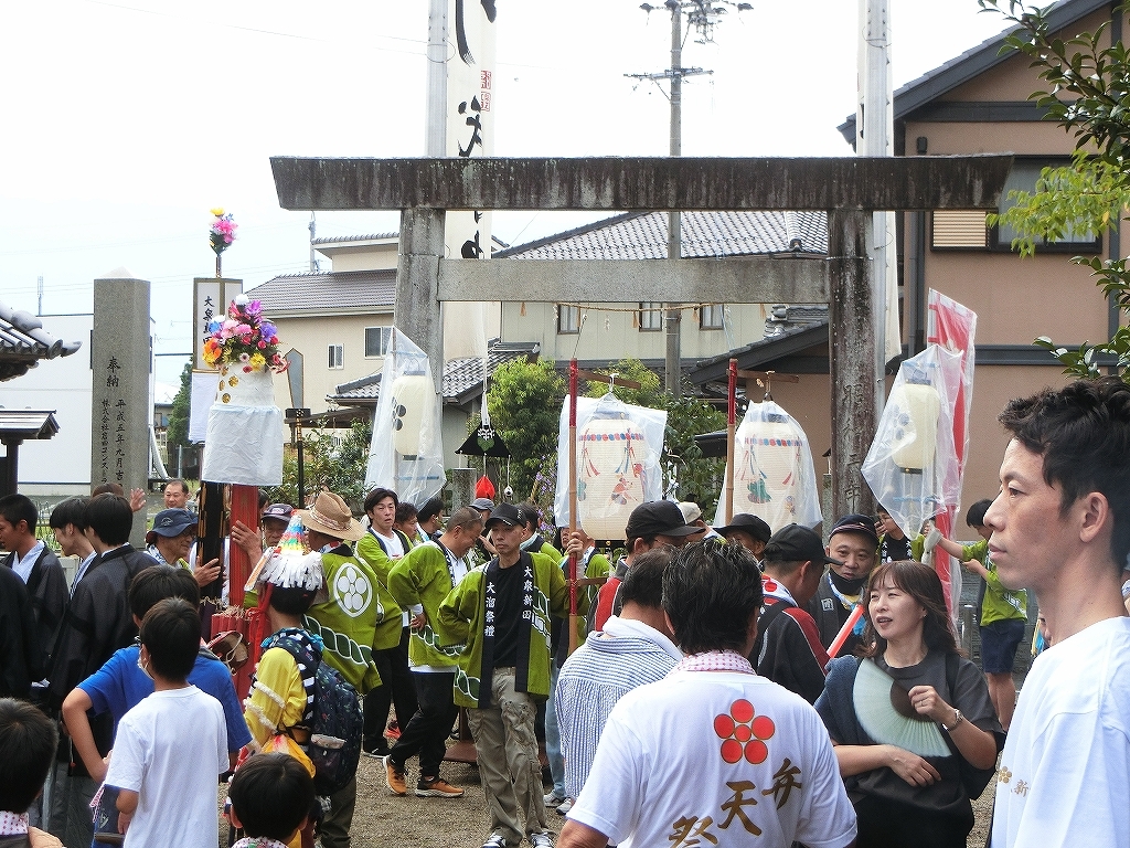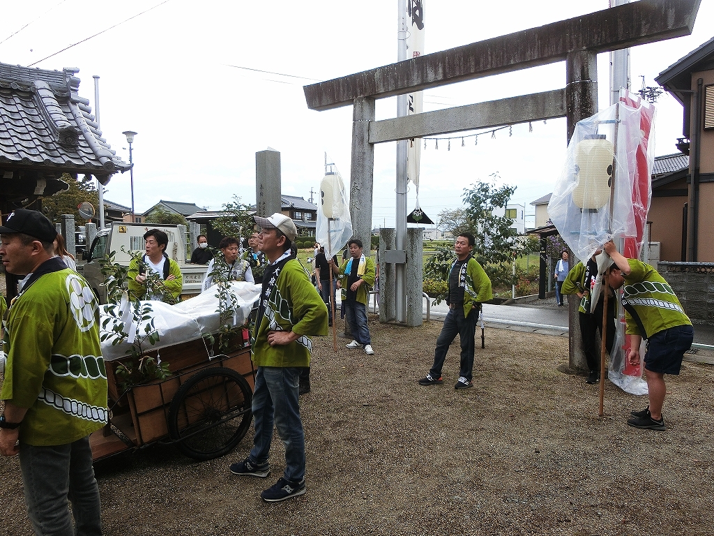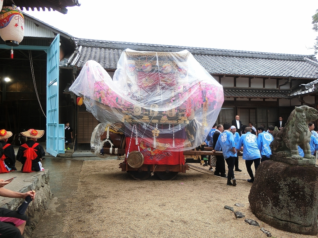 大泉新田神明社境内で出発を待つ、祭車にはシートが掛けられています。