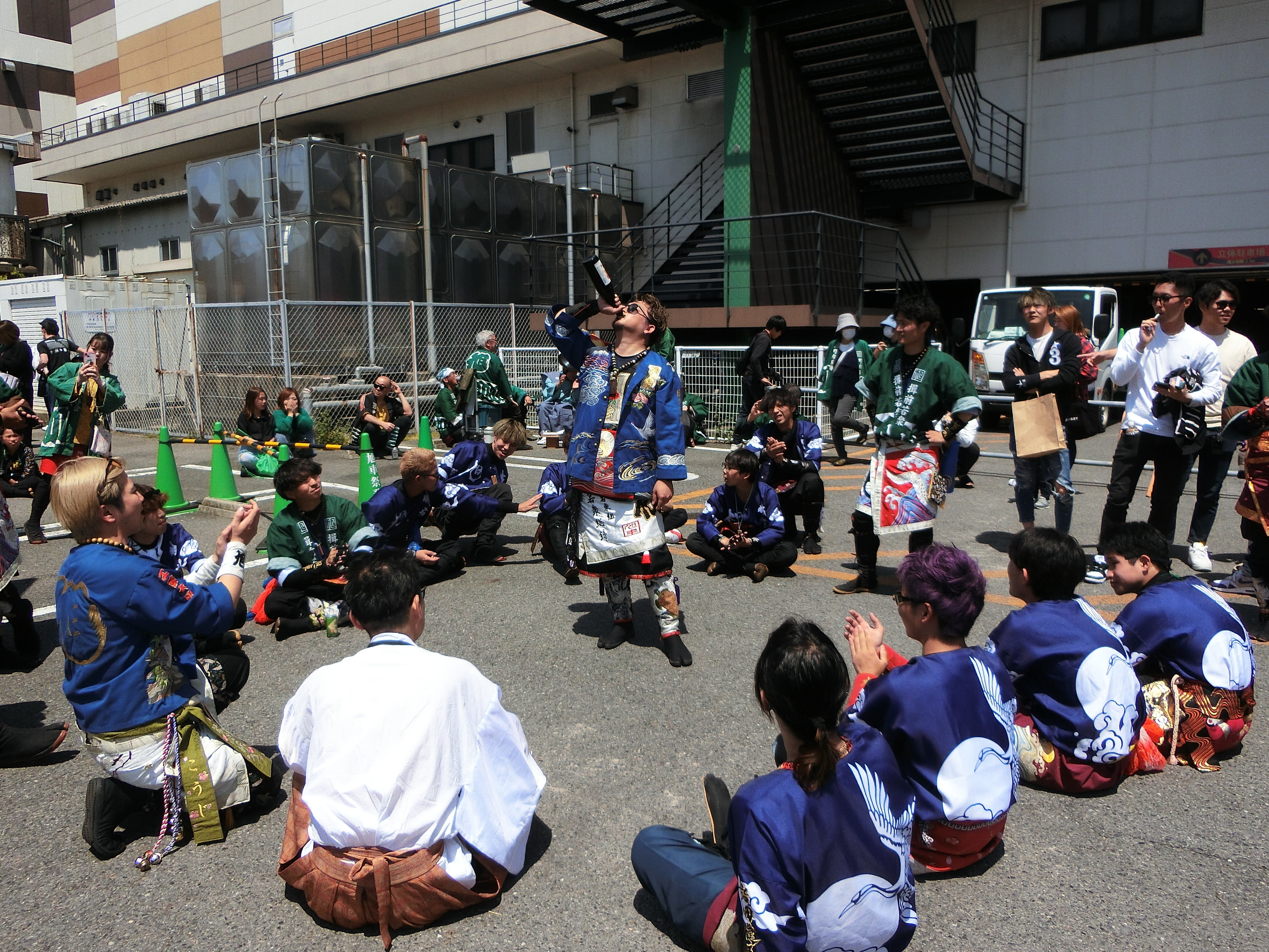 山車の前では若衆が宴会を行っていました。