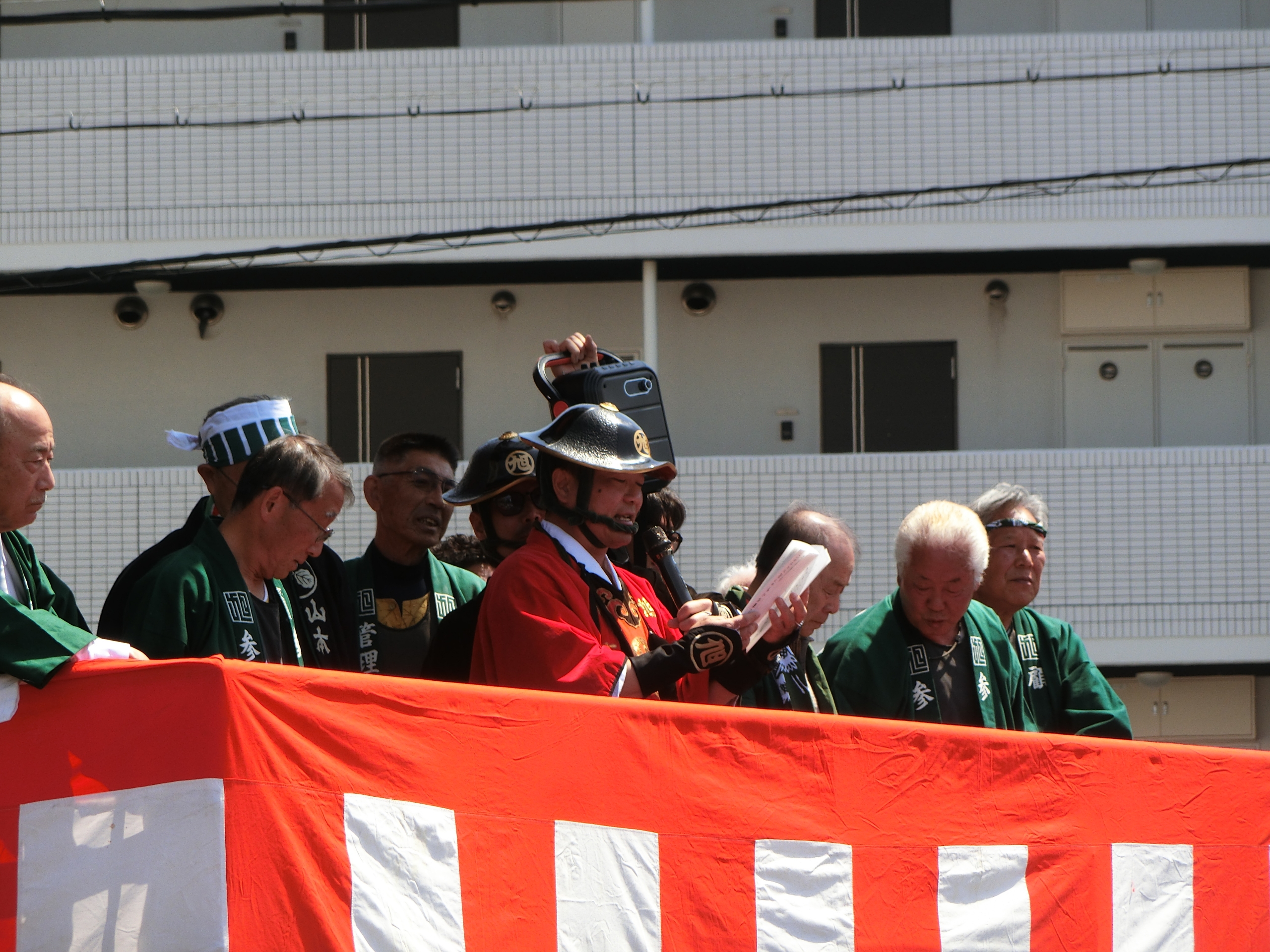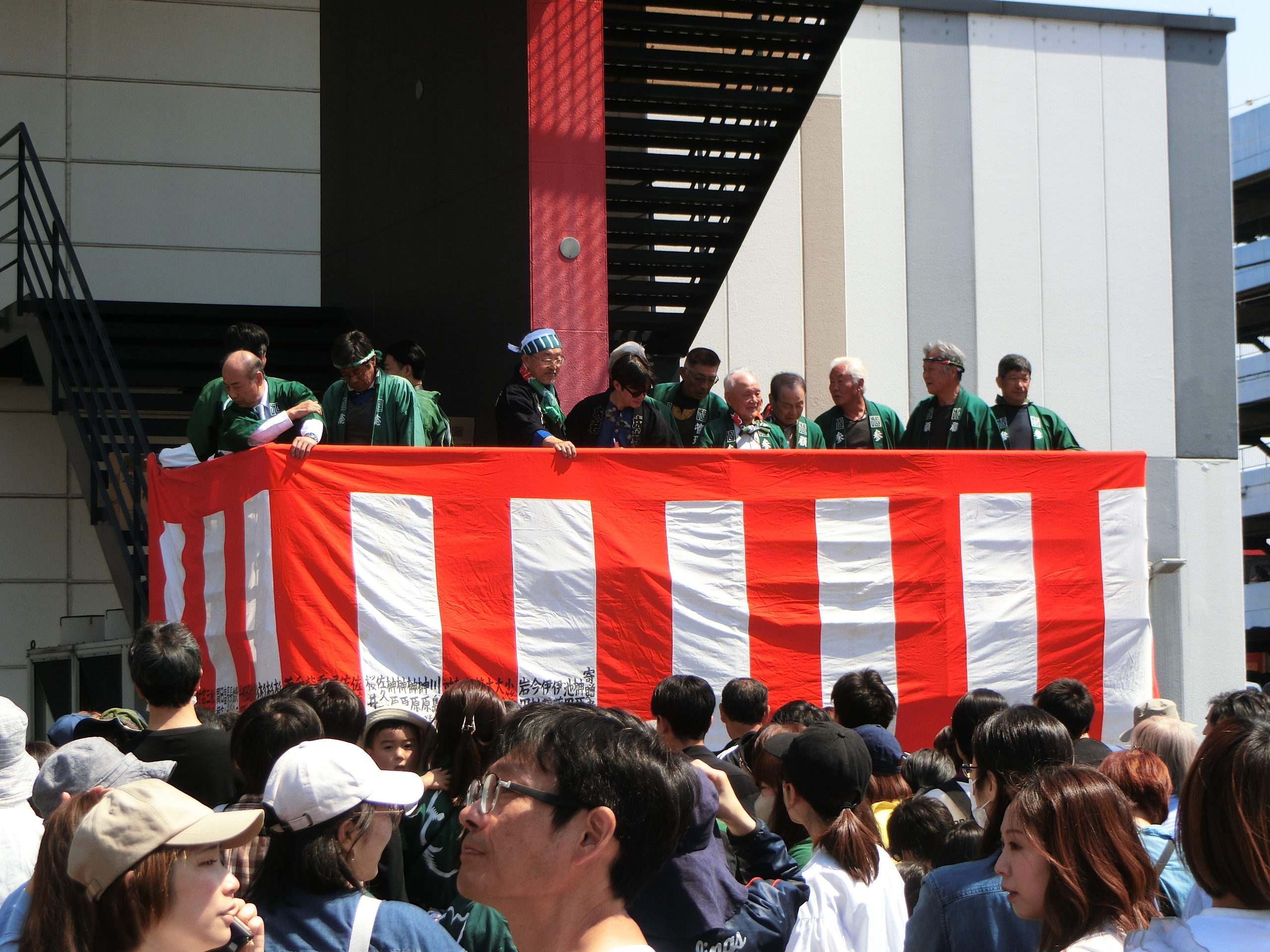 コロナワールド外階段で挨拶が読み上げられました。