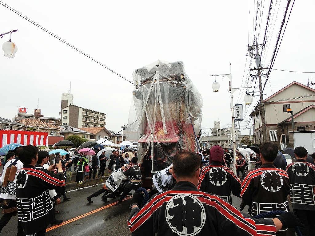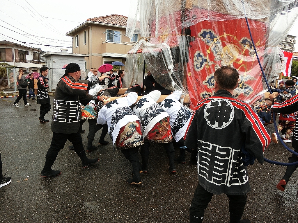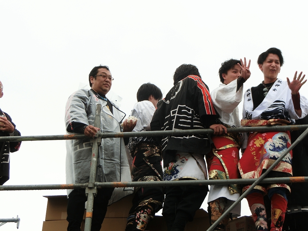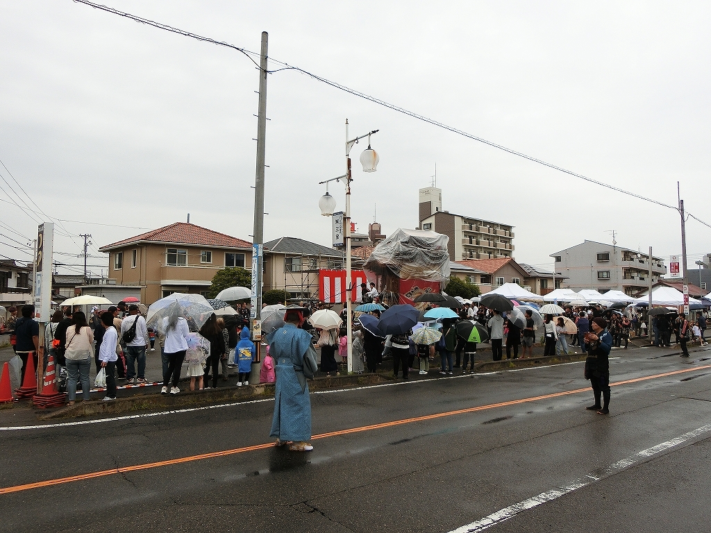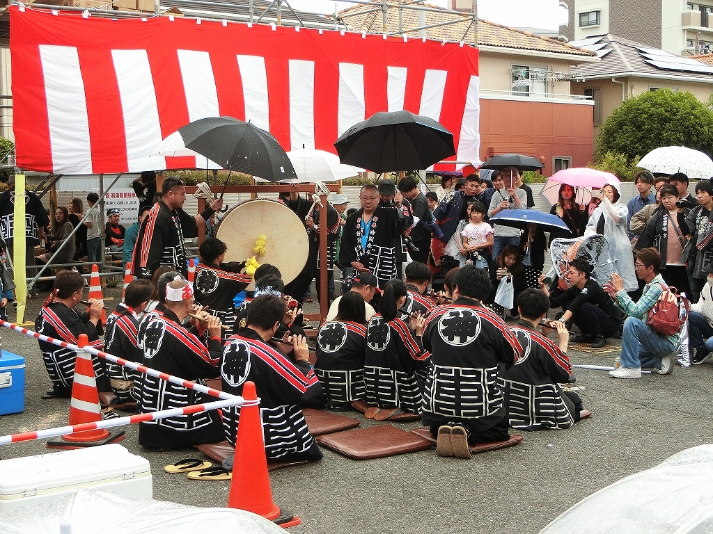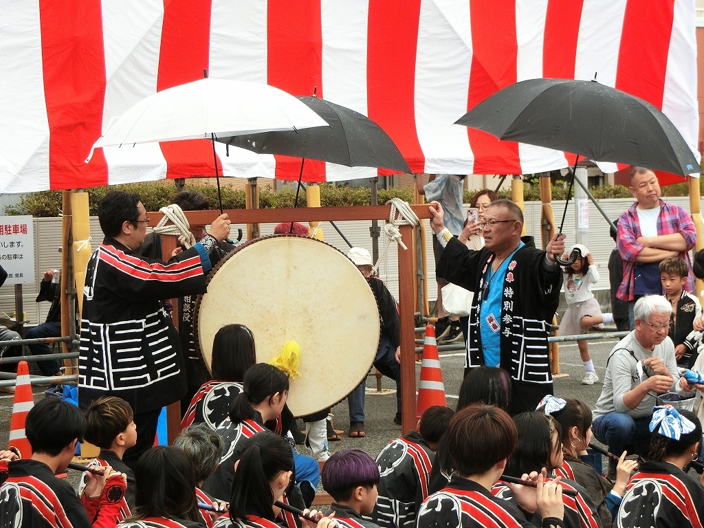 途中で雨が降りだしたため、傘を差して大太鼓を守りました。