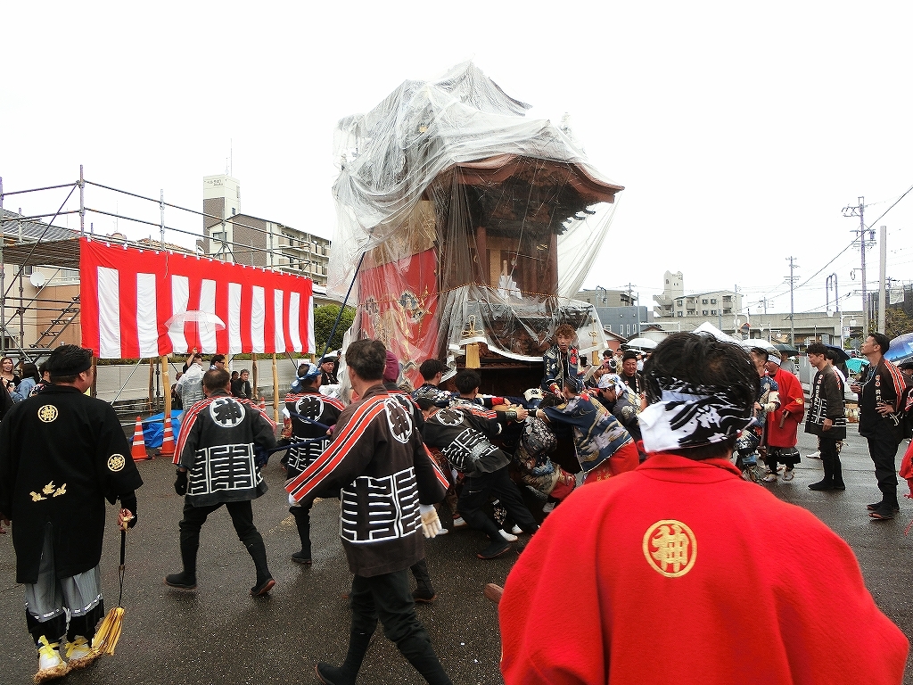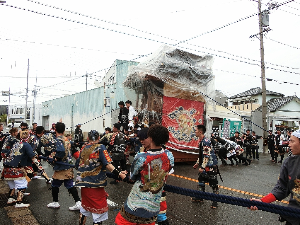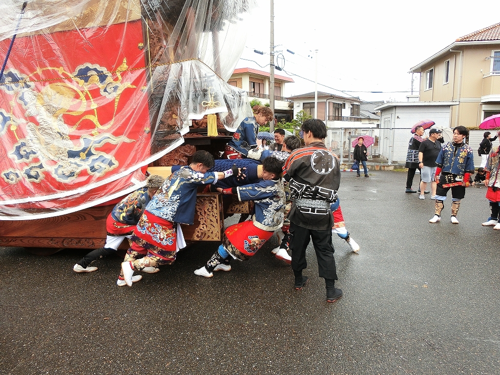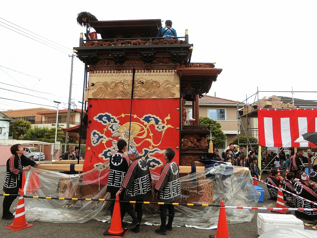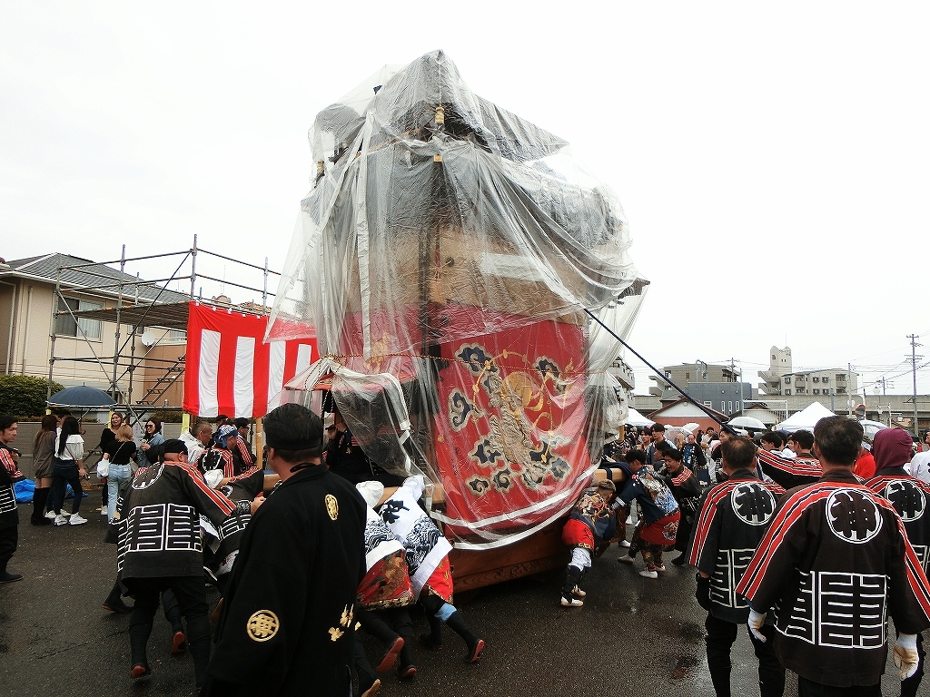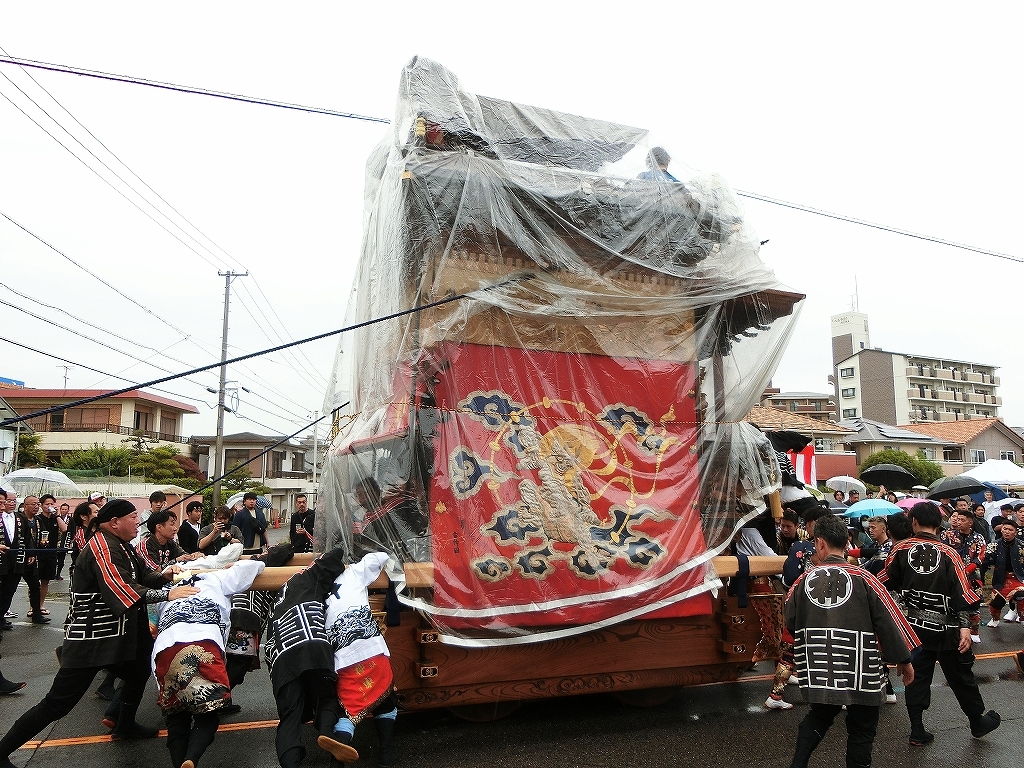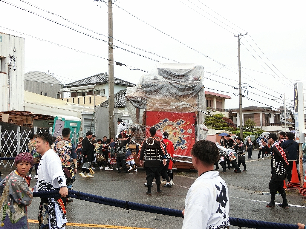 途中で雨が降りだしたため、傘を差して大太鼓を守りました。