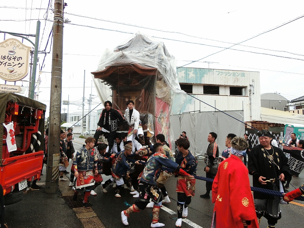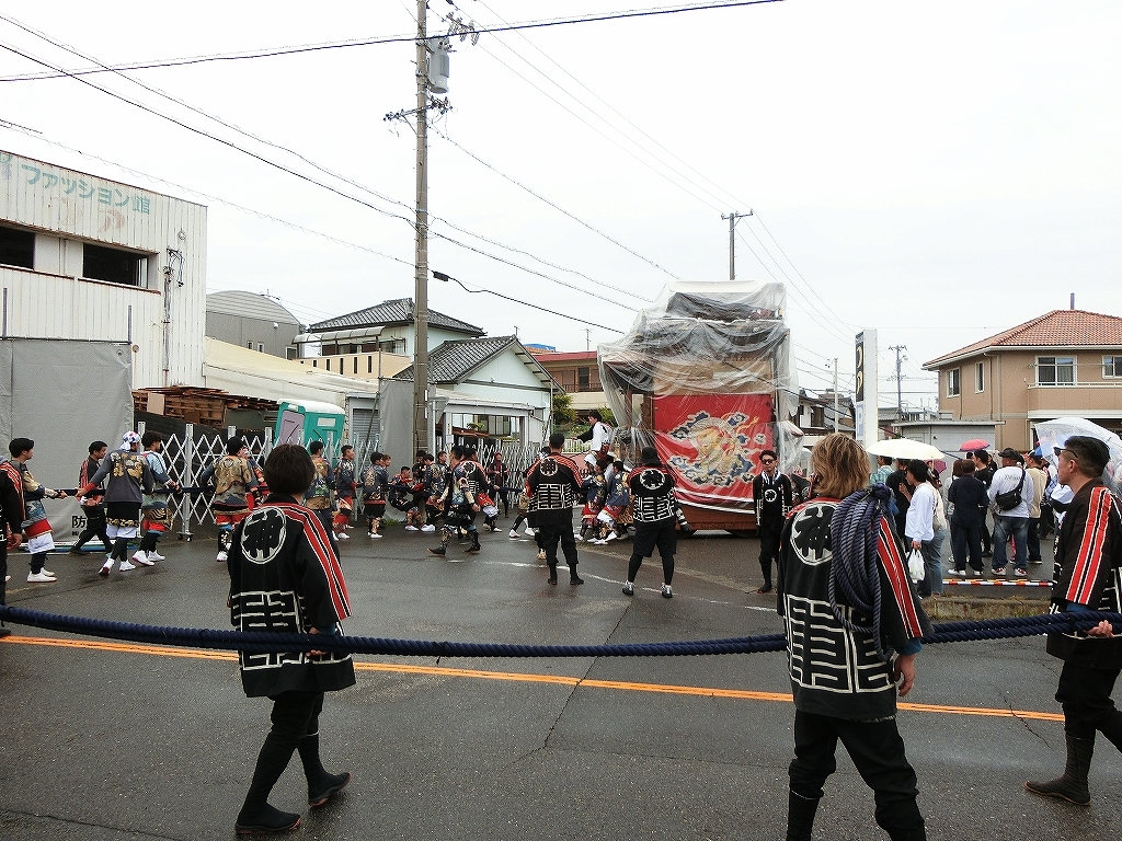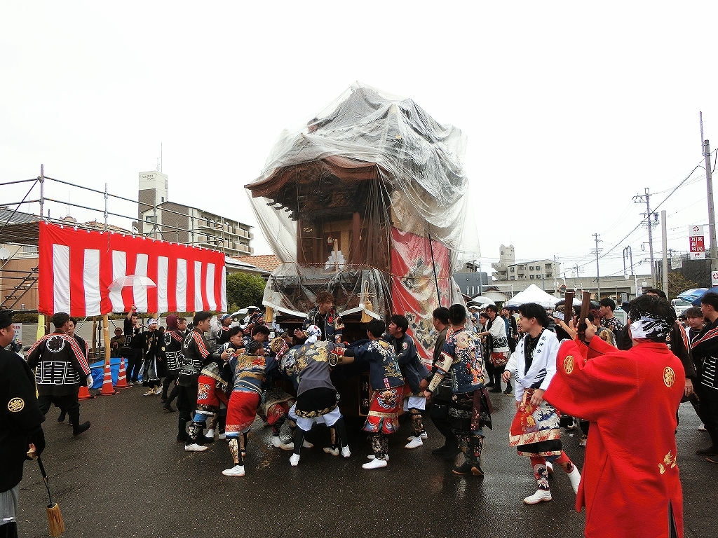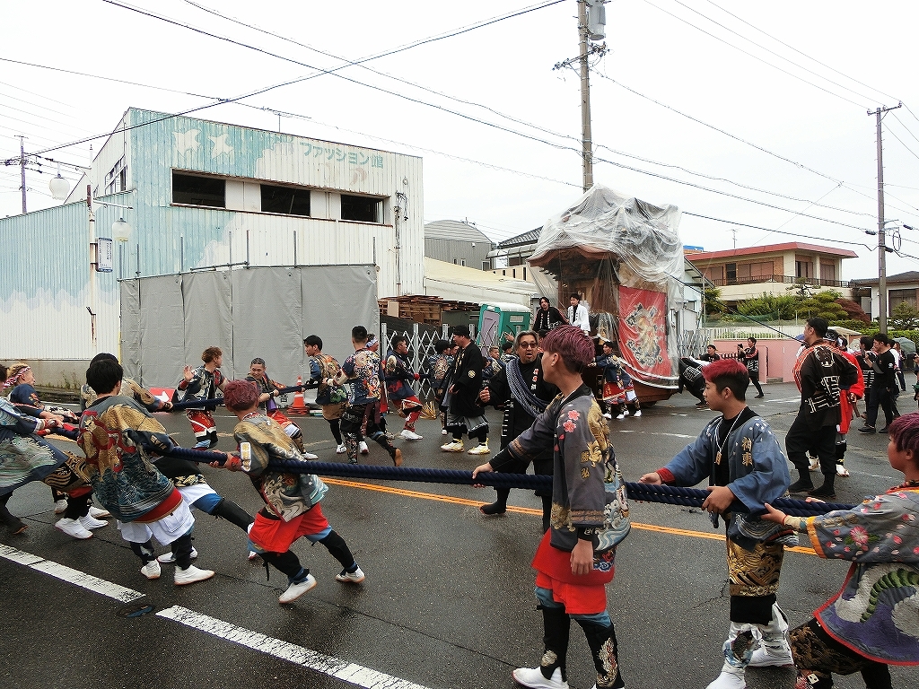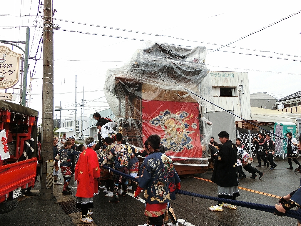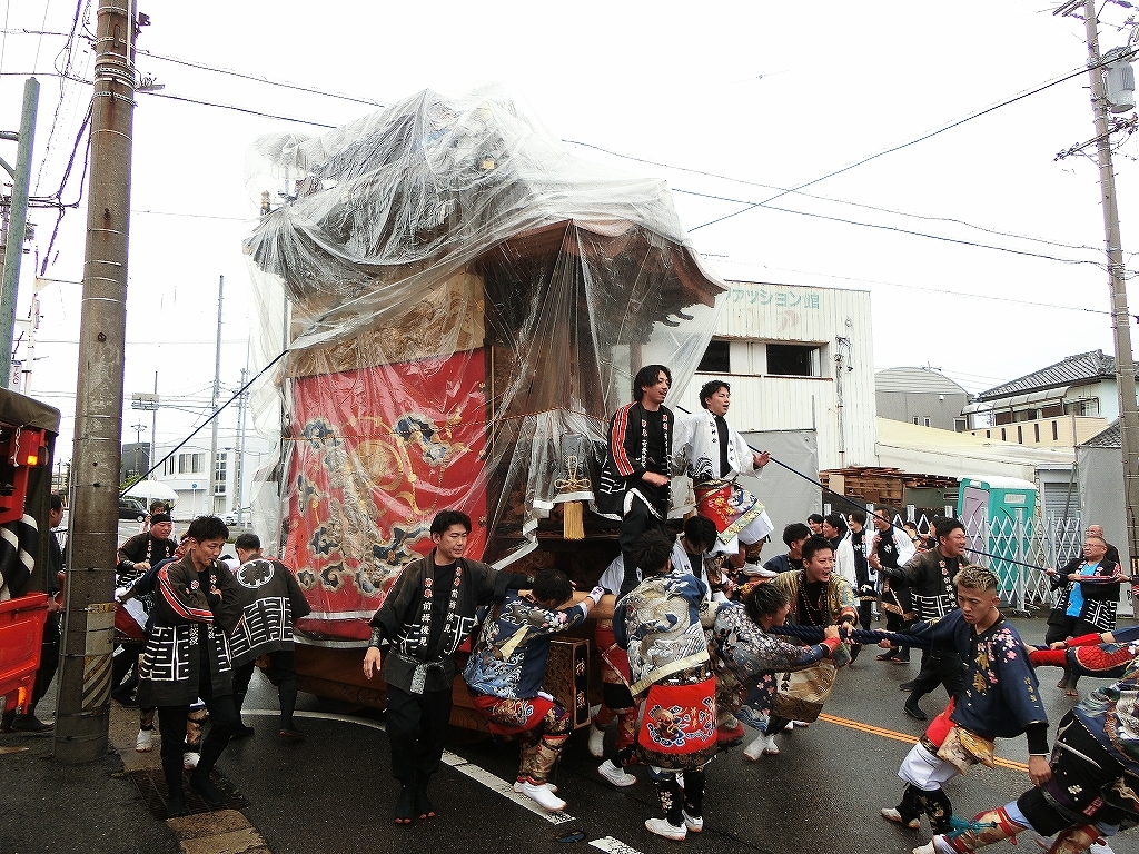 途中で雨が降りだしたため、傘を差して大太鼓を守りました。