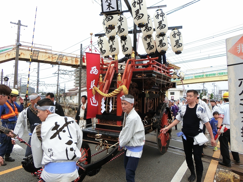 東海道では第九組福江町祭車が、第十組祭車通過を待っていました。