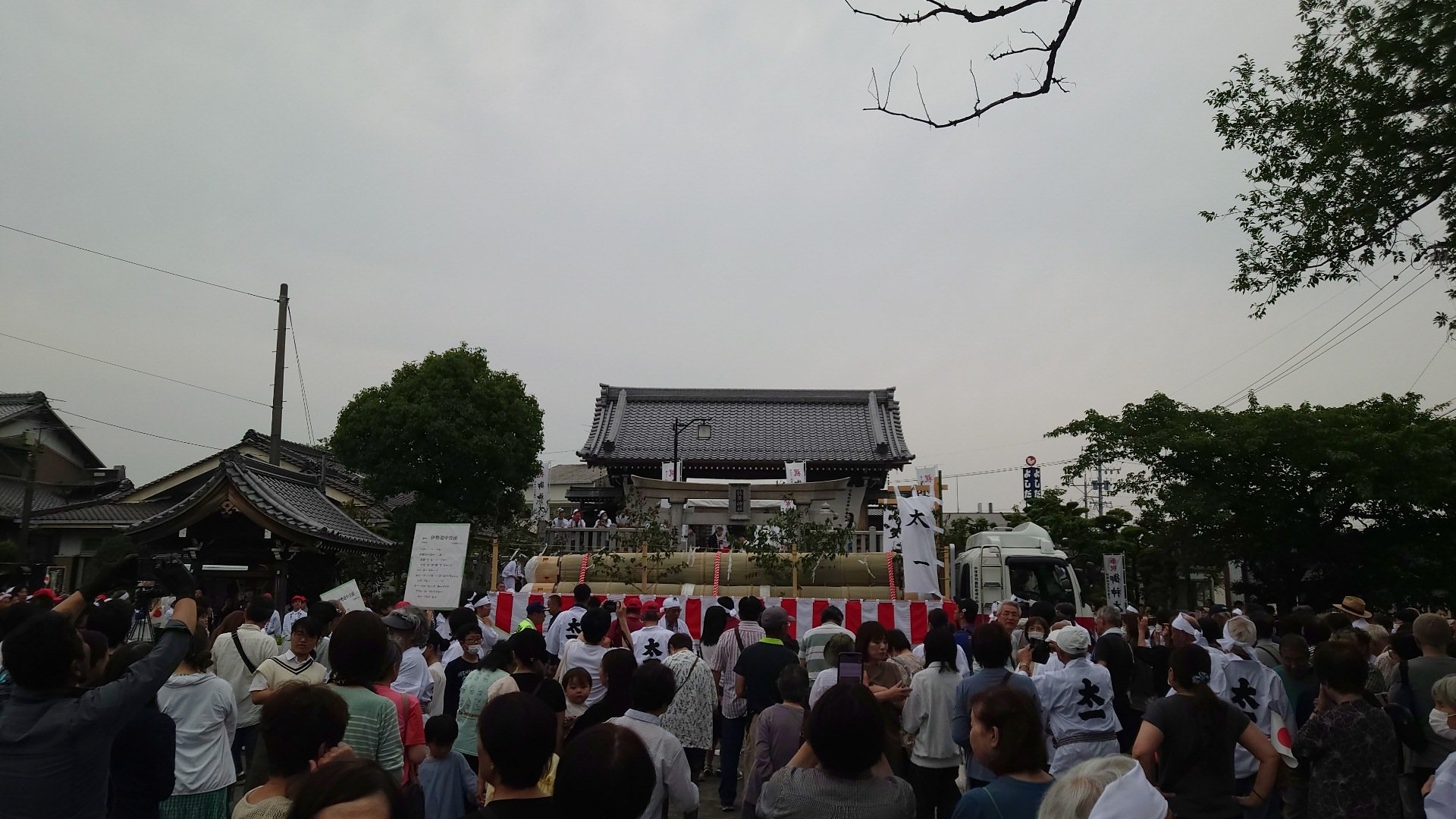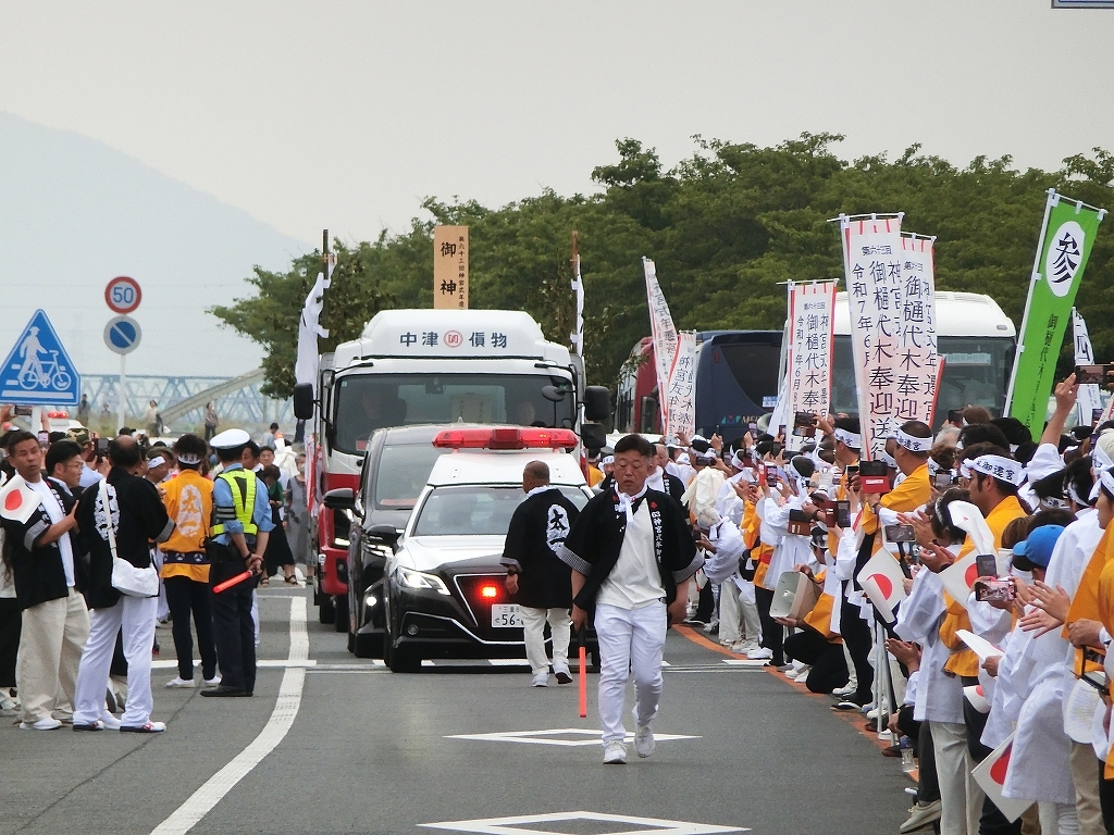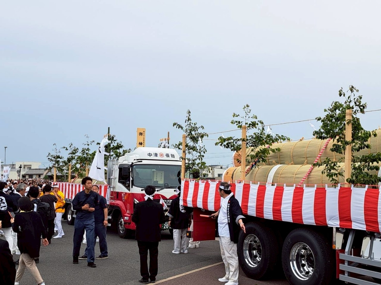 岐阜市を出た御神木は、垂井町南宮大社や羽島市八劔神社を経て、海津市今尾地区で迎えられました。