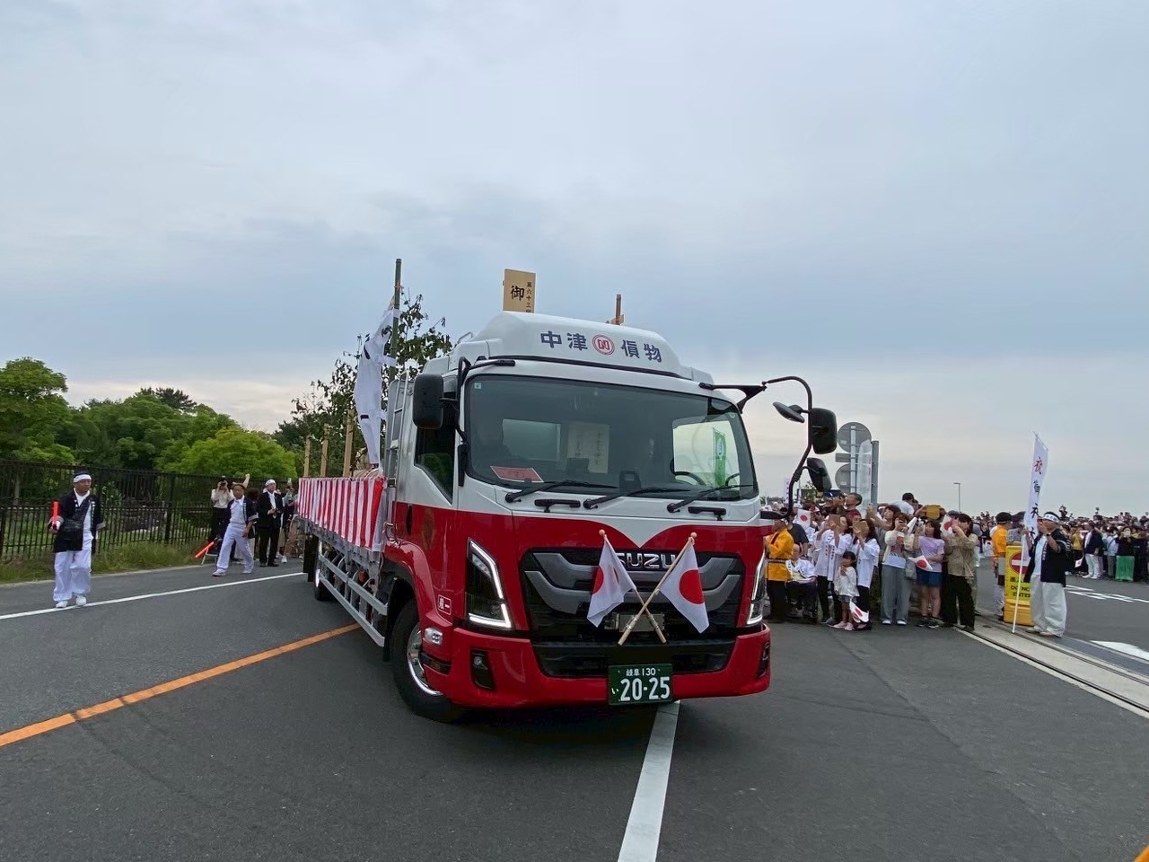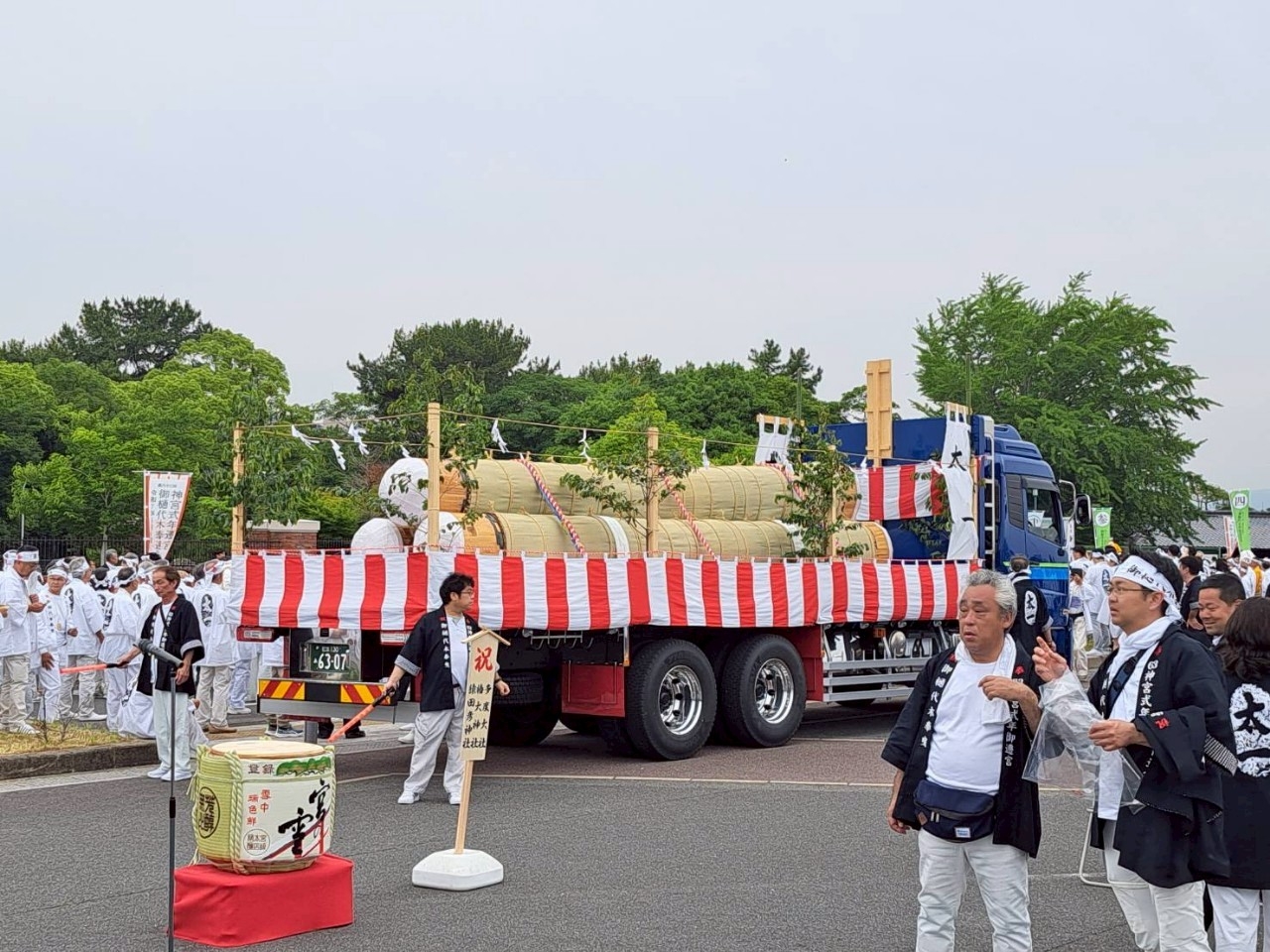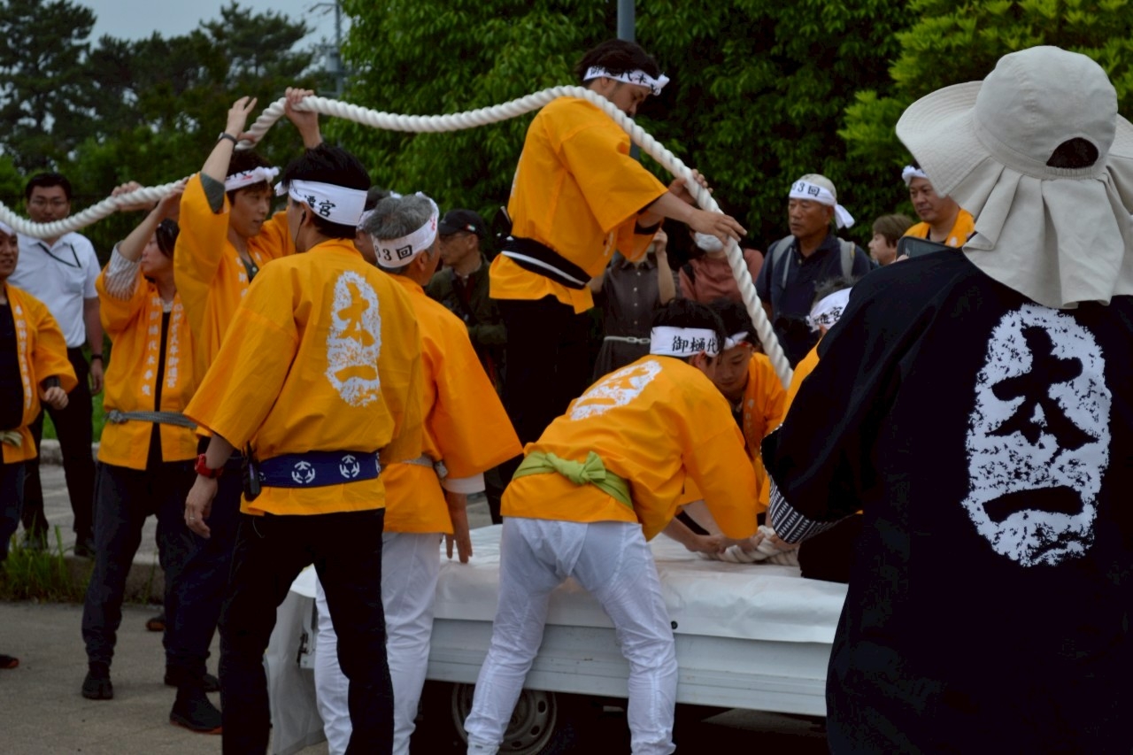 岐阜市を出た御神木は、垂井町南宮大社や羽島市八劔神社を経て、海津市今尾地区で迎えられました。
