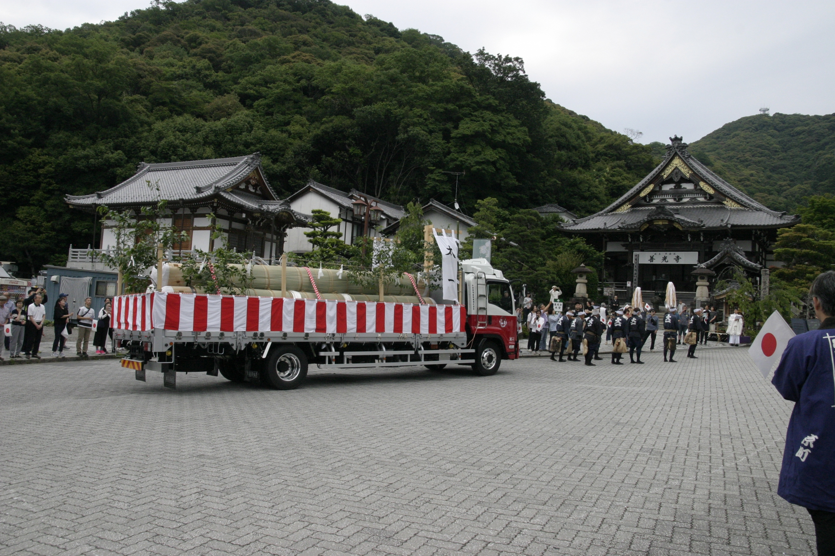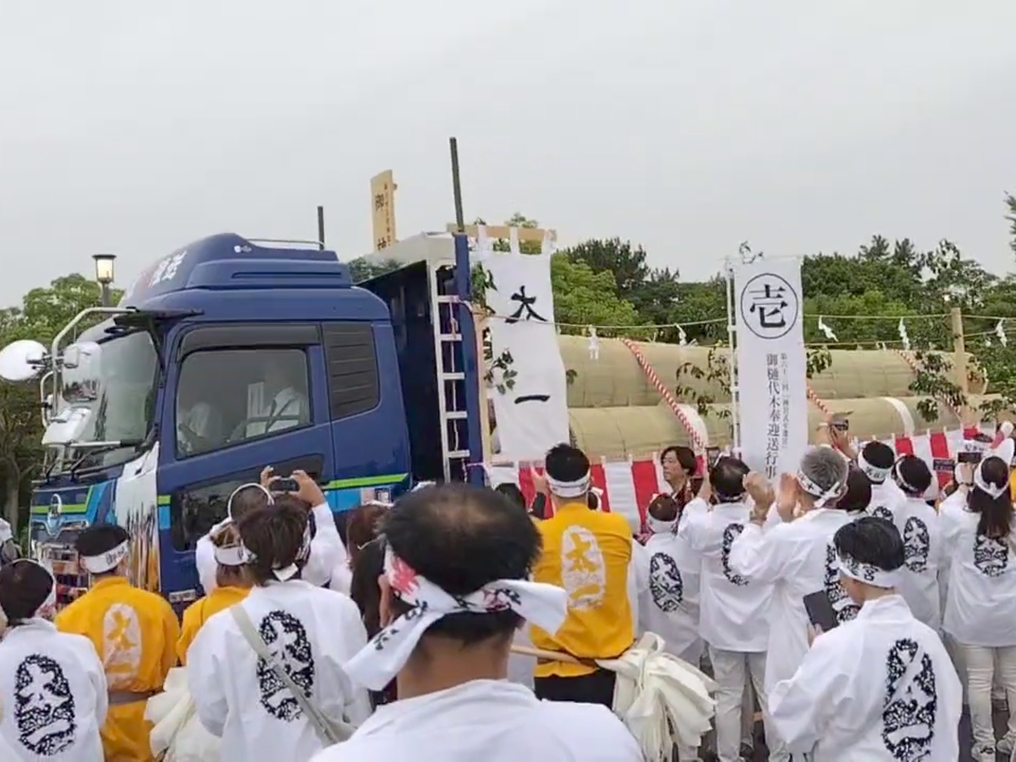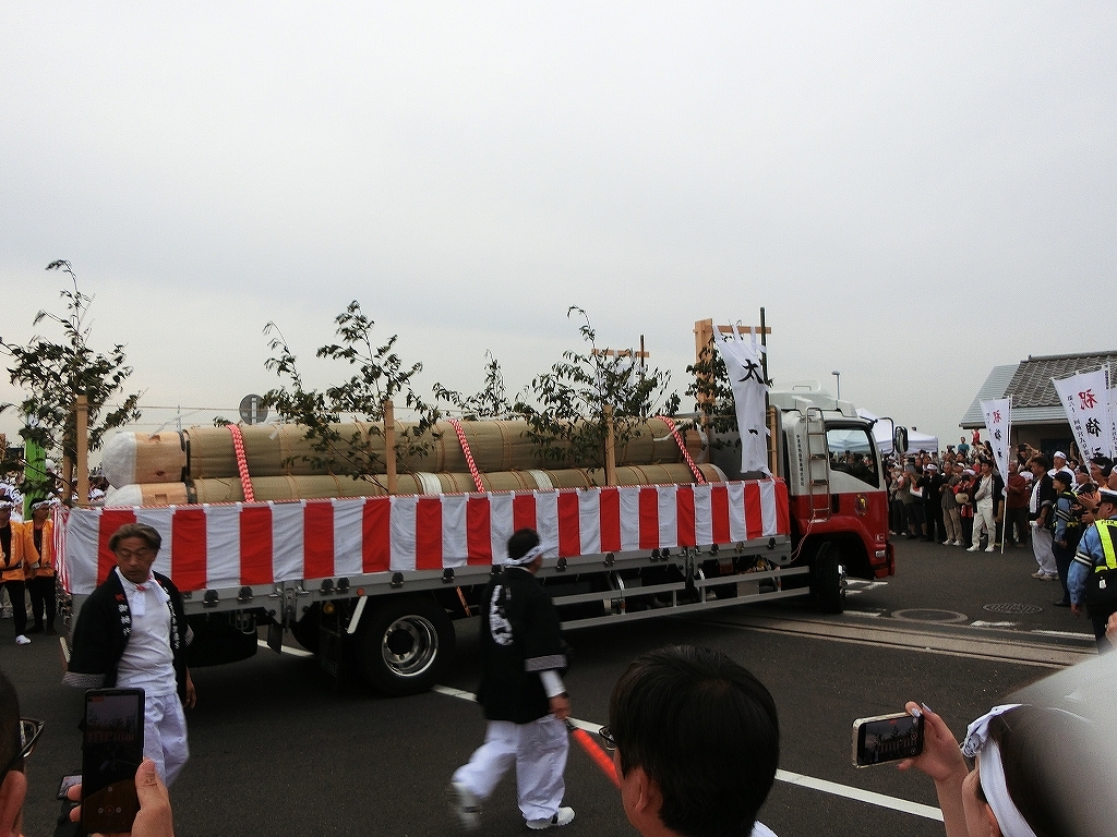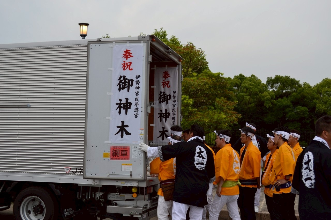 午後4時36分、予定より早く愛知県からの御神木を載せた10tトラックが到着しました。
