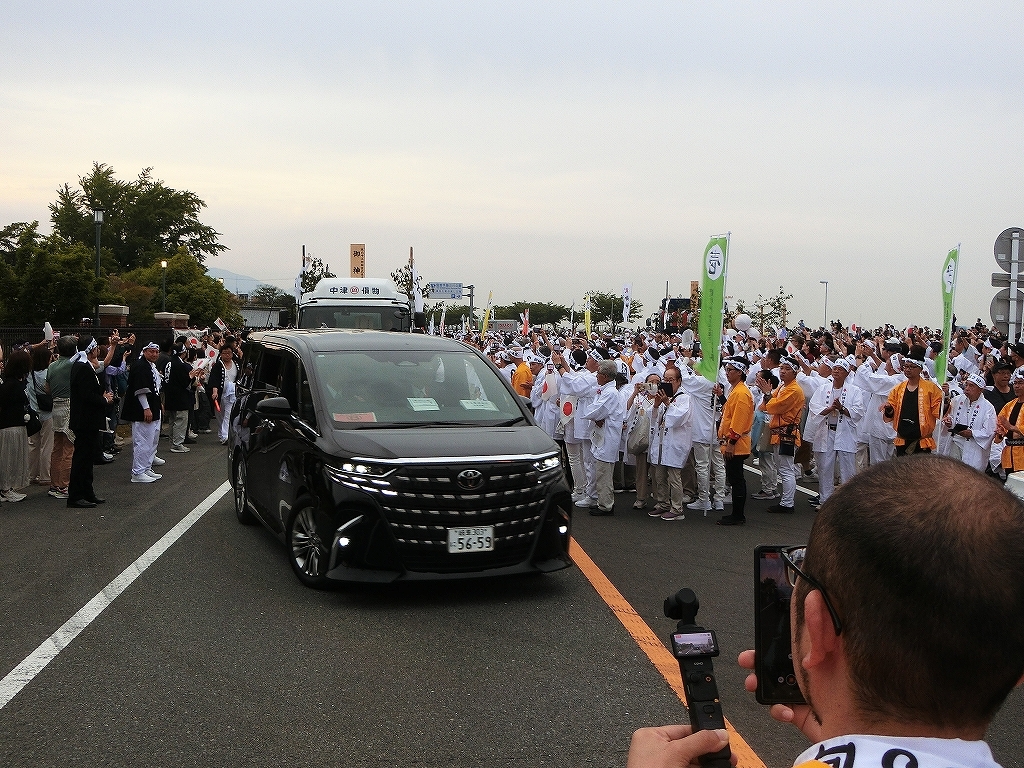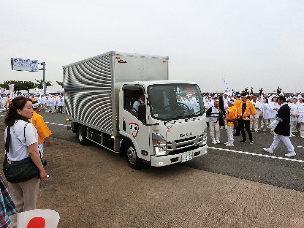 2台のトラックが揃うと、愛知県と岐阜県より三重県へと引き継ぐ式典が行われました。