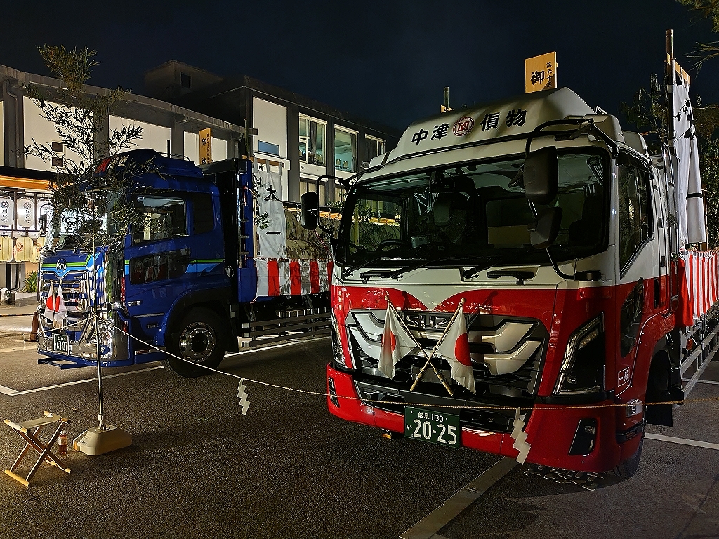 裏木曽御用材を運ぶ中津貨物自動車の8tトラックのナンバープレートは、20-25(2025年)でした。