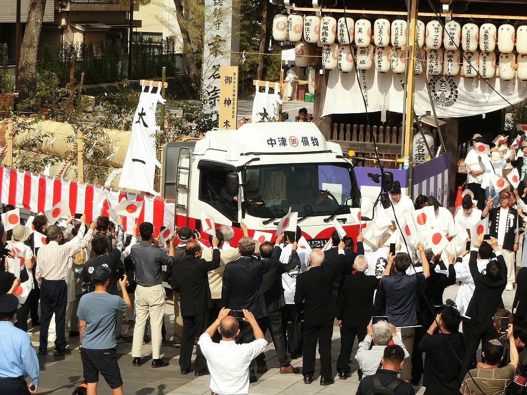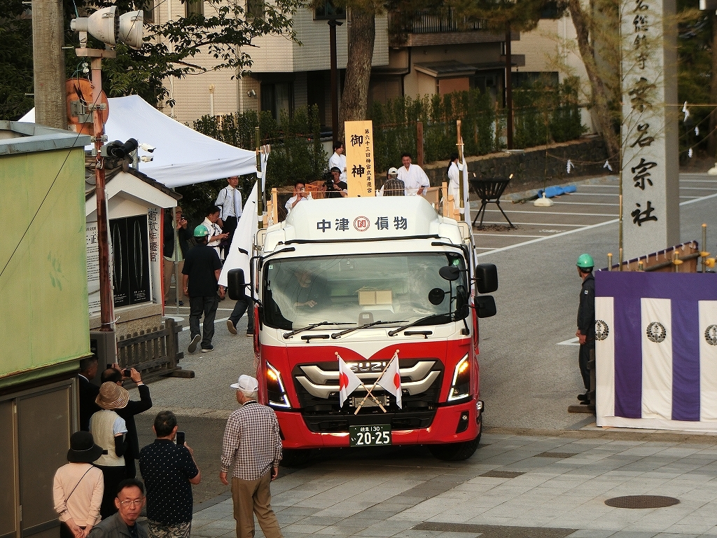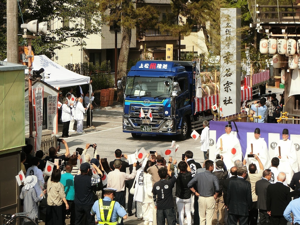 上松陸送のトラックが先にバックで境内に戻ります。