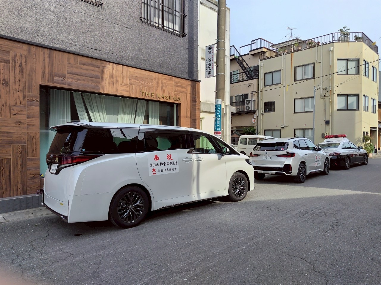 先導はパトカーで、関係者の乗る高級車も列を成しています。