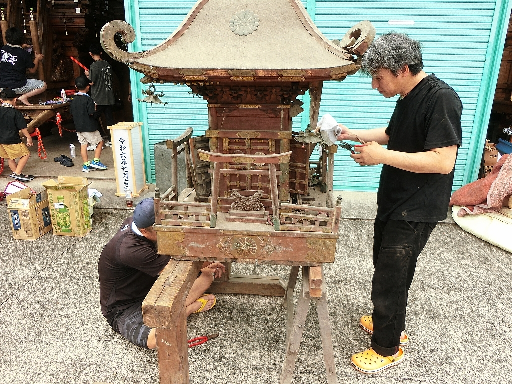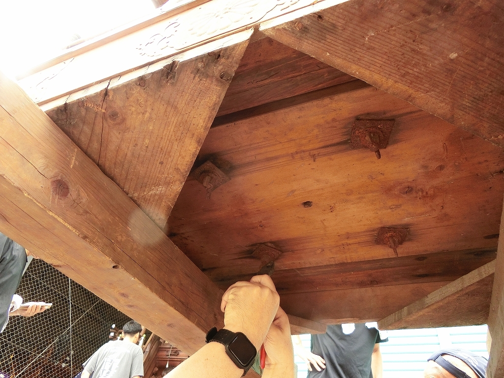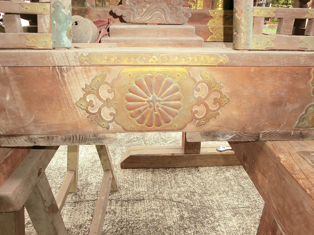 神輿の構造には詳しくないのでよくわかりませんが、この神輿は屋根材には下地しかなく錺金具で屋根の形を作っているようです。