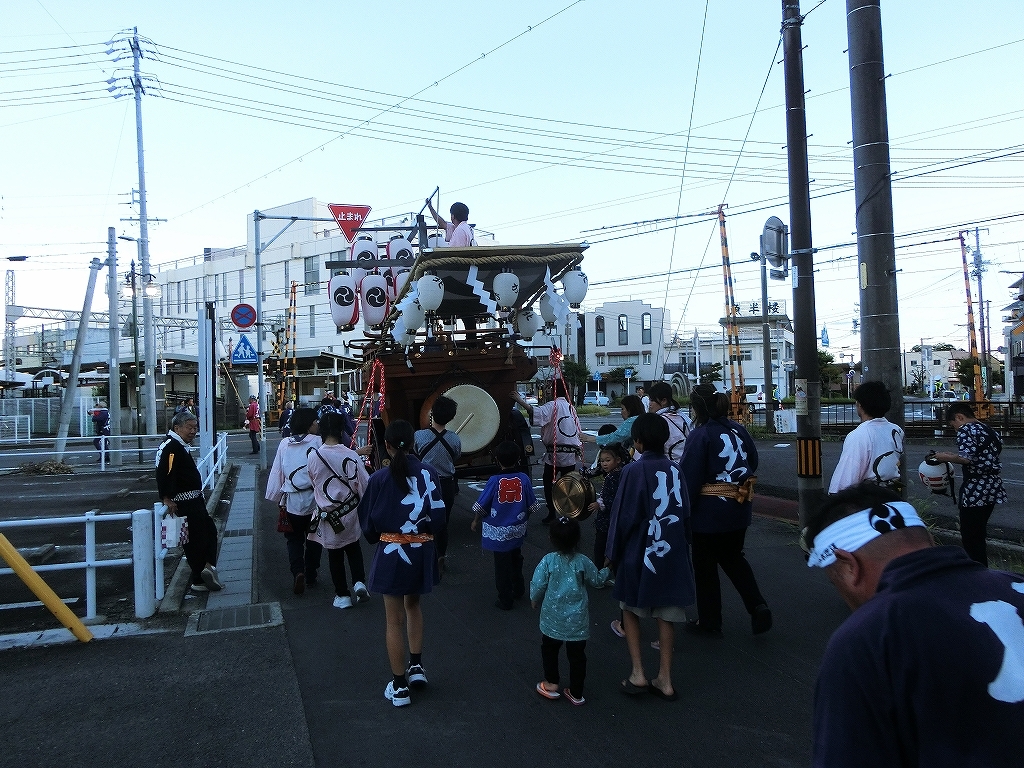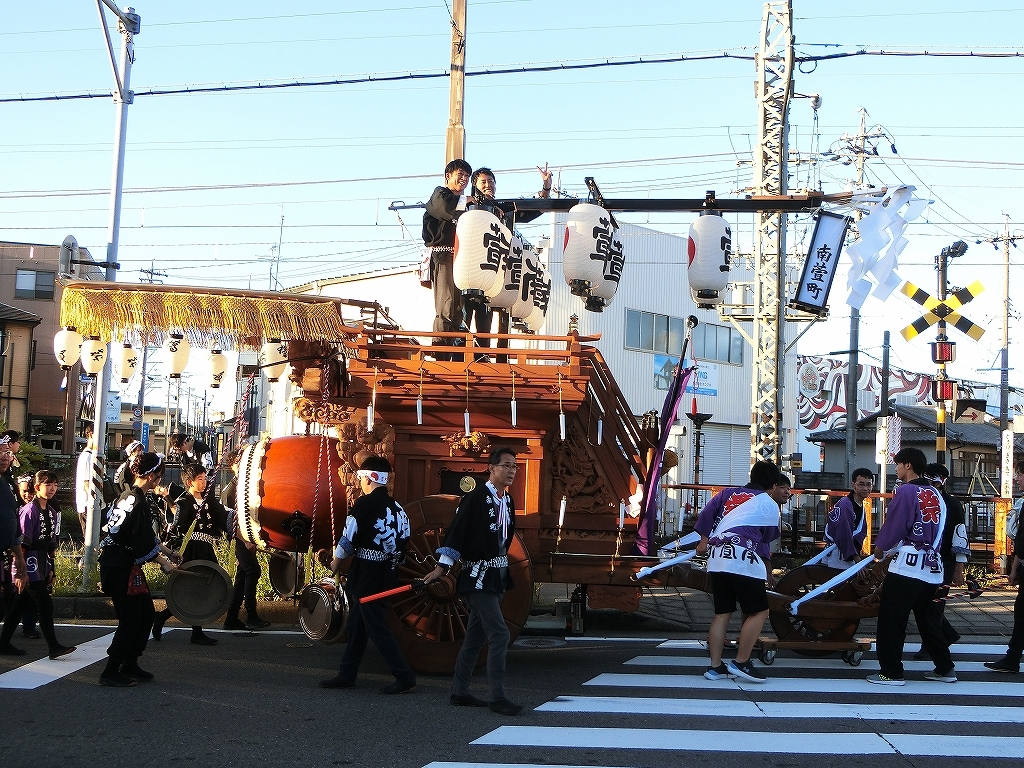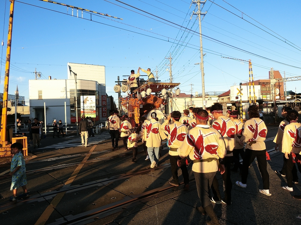 踏切手前を東へと進み、常盤町祭車とすれ違います。