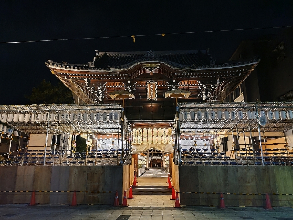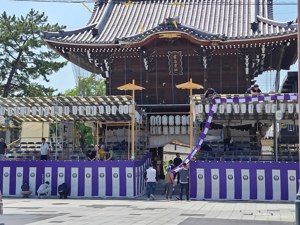 本楽の6日前から楼門前に桟敷席の組み上げが始まり、3日前までに形作られます。