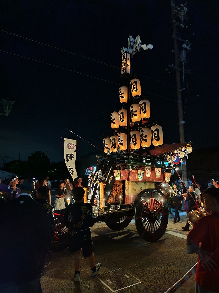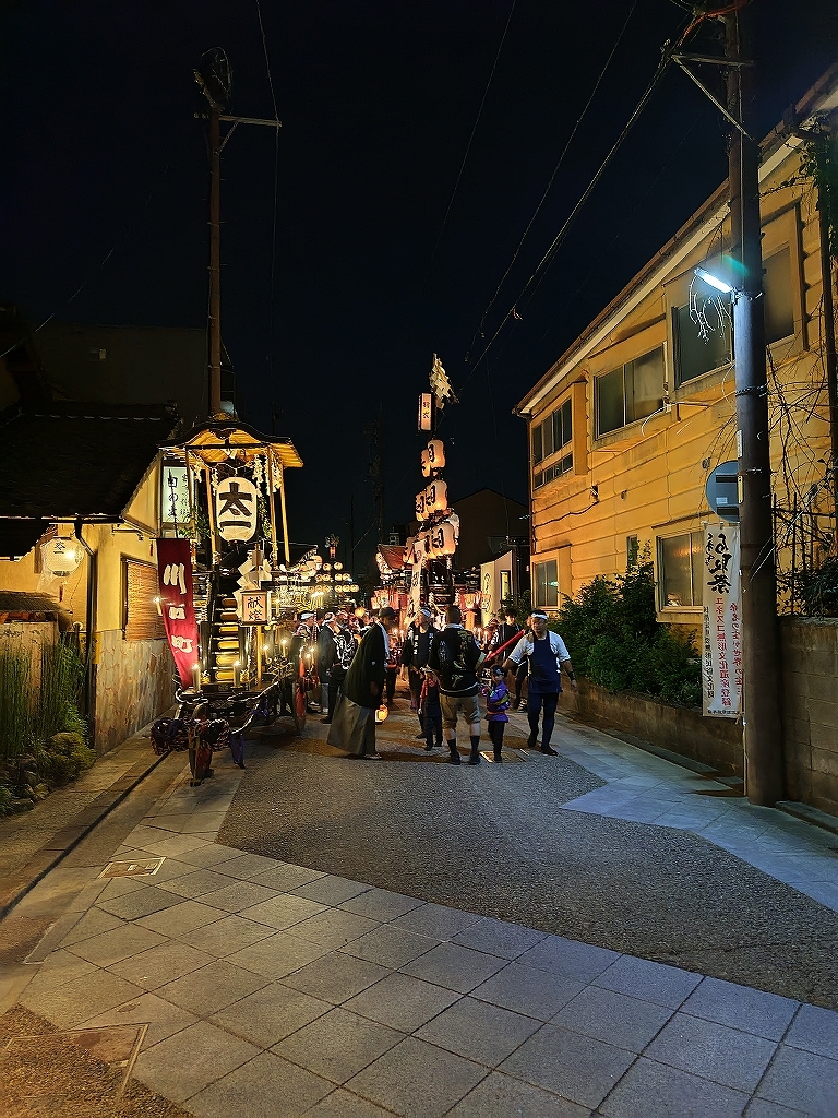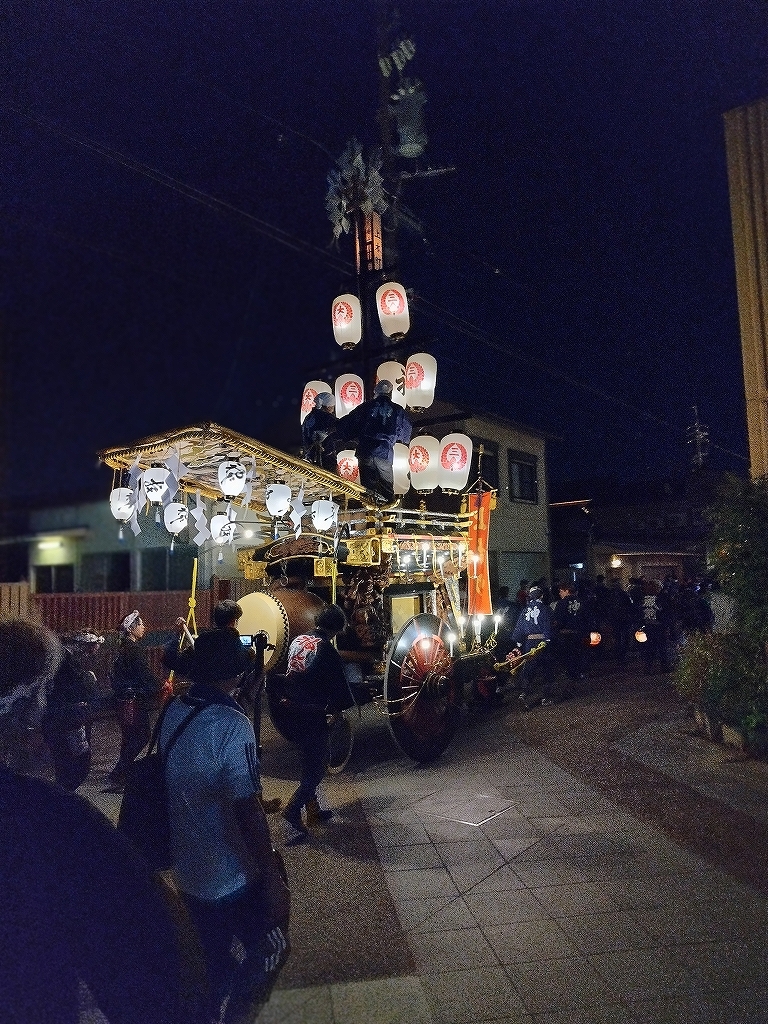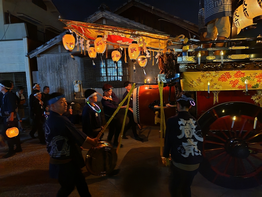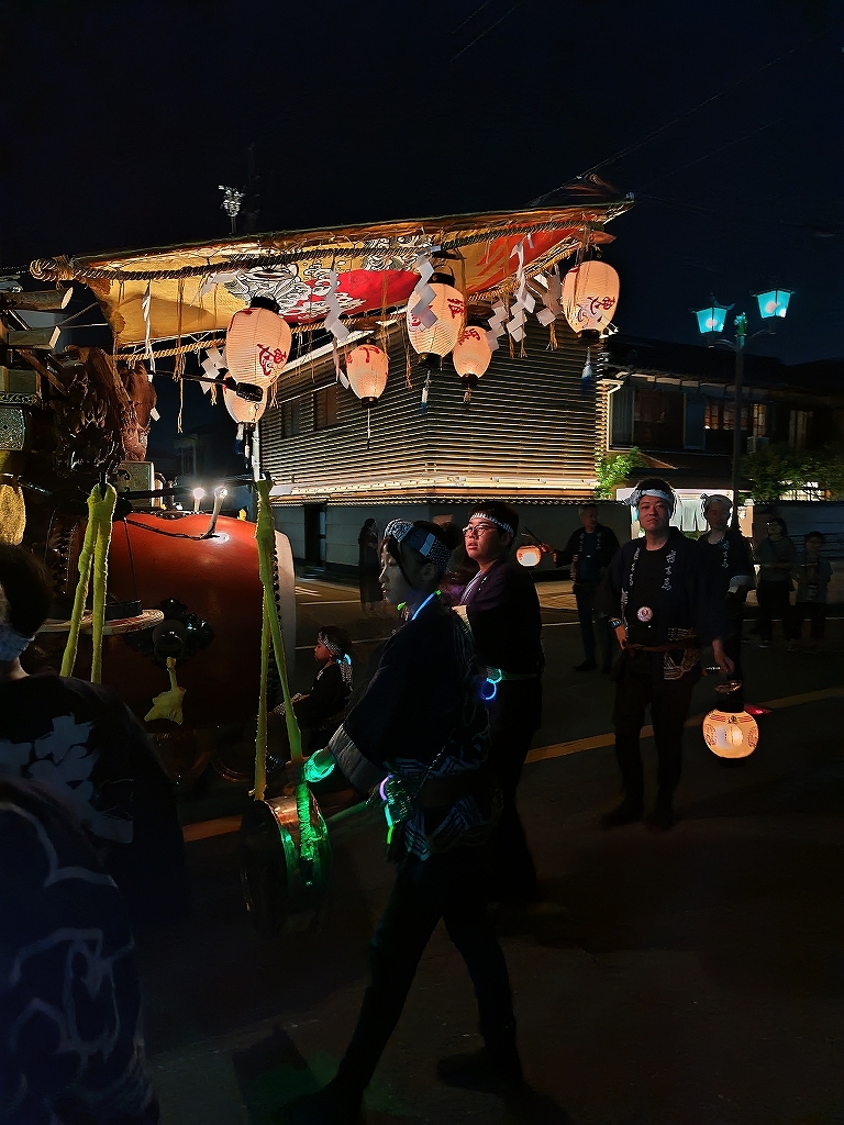 上本町整列後、自町に戻っていた花街川口町祭車を追い越します。