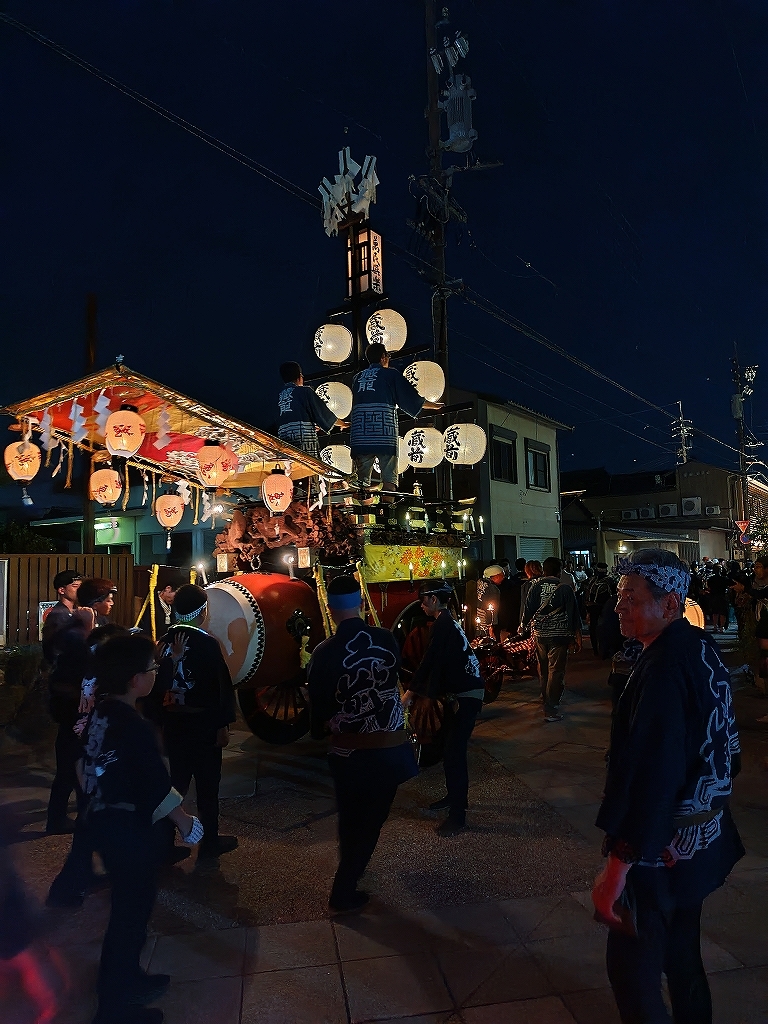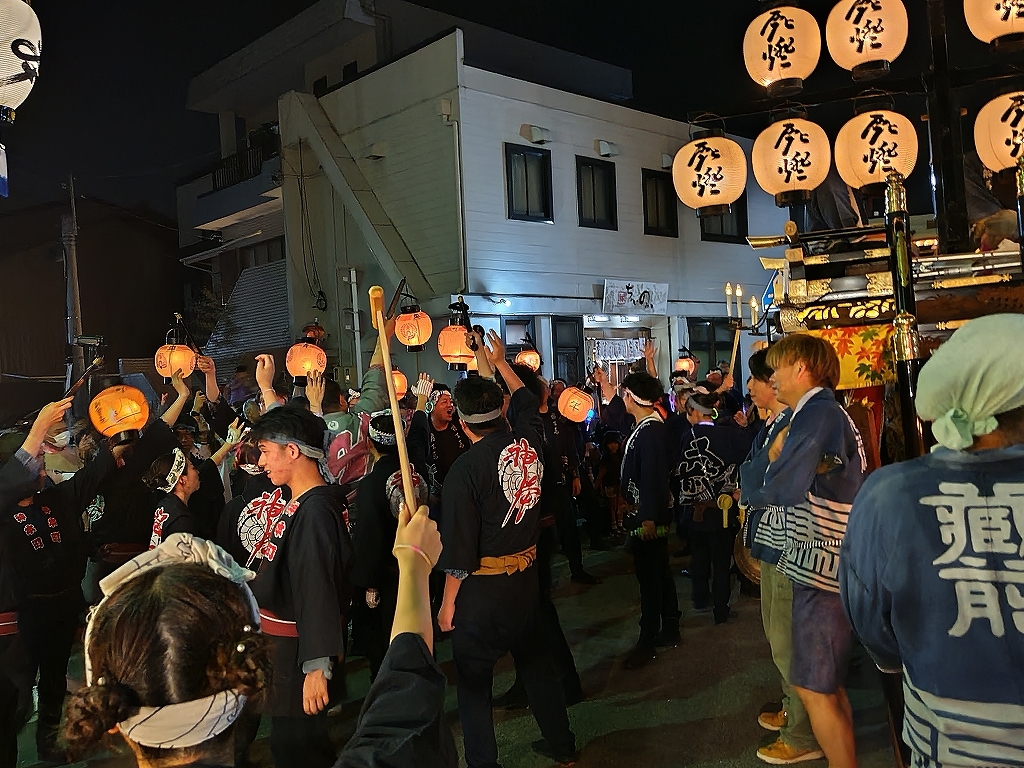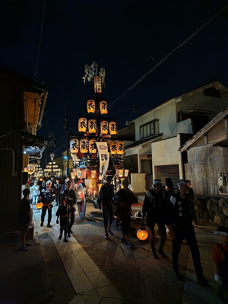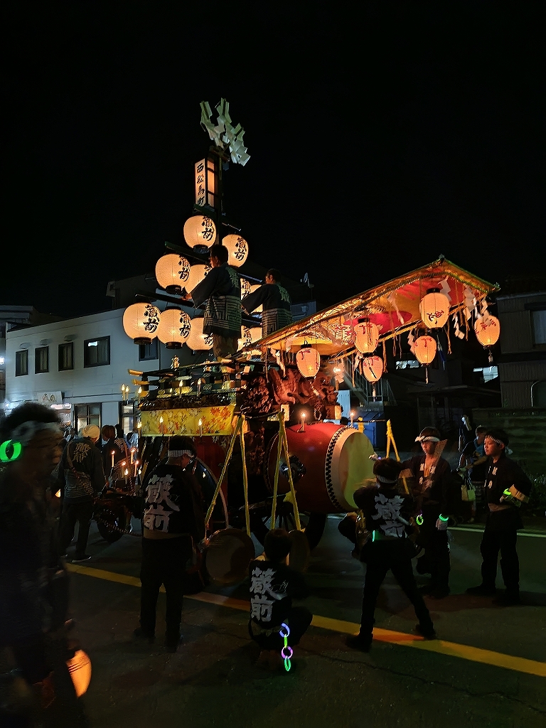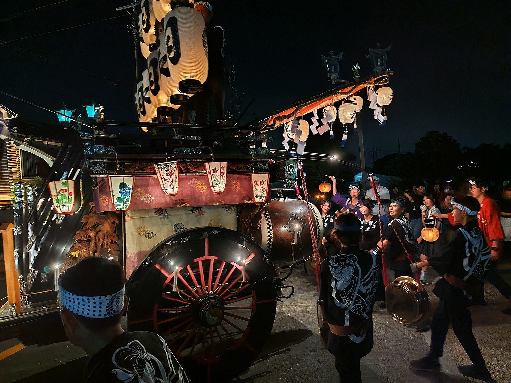 上本町整列後、自町に戻っていた花街川口町祭車を追い越します。