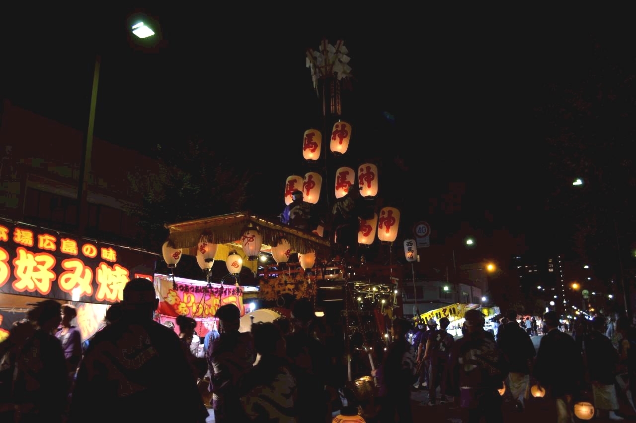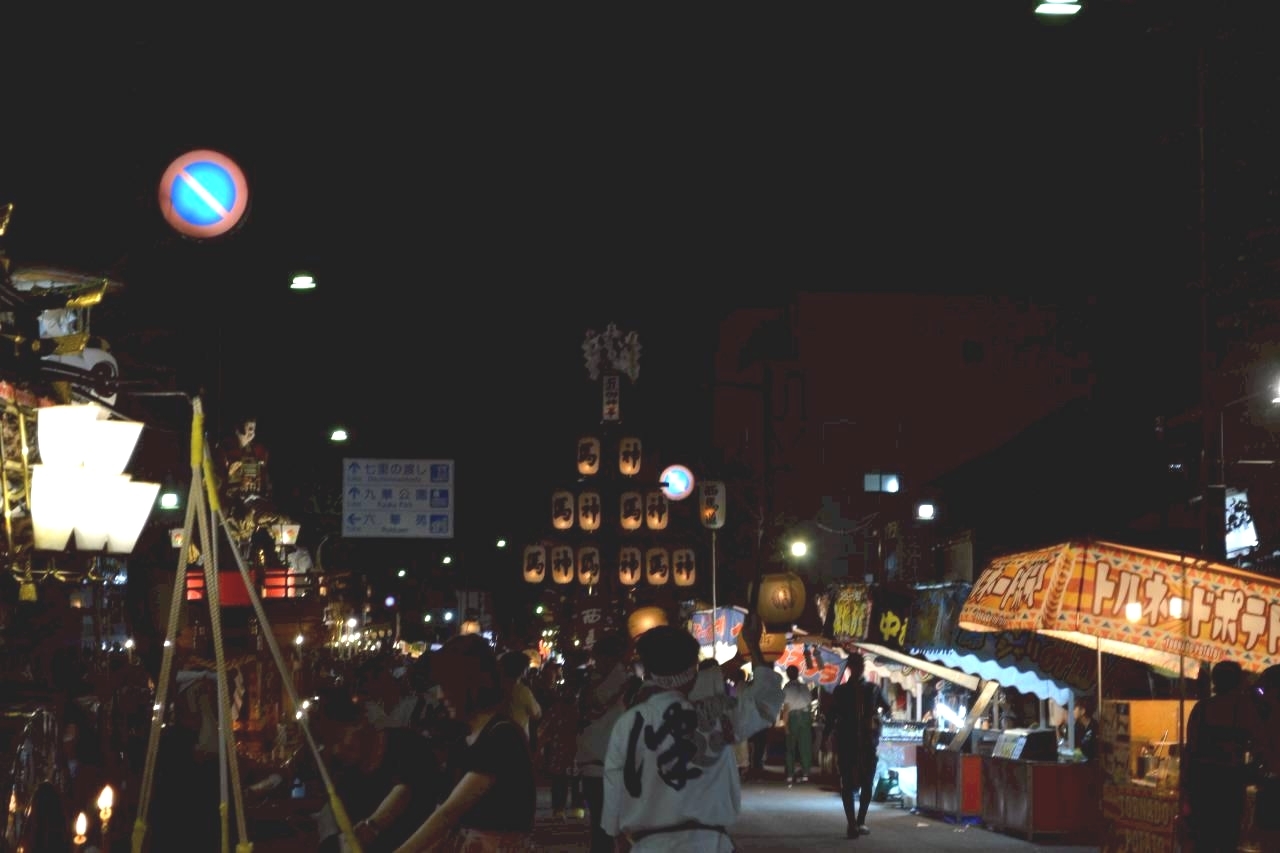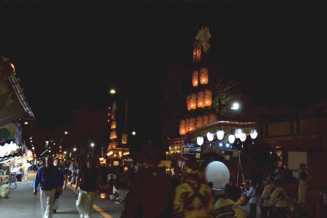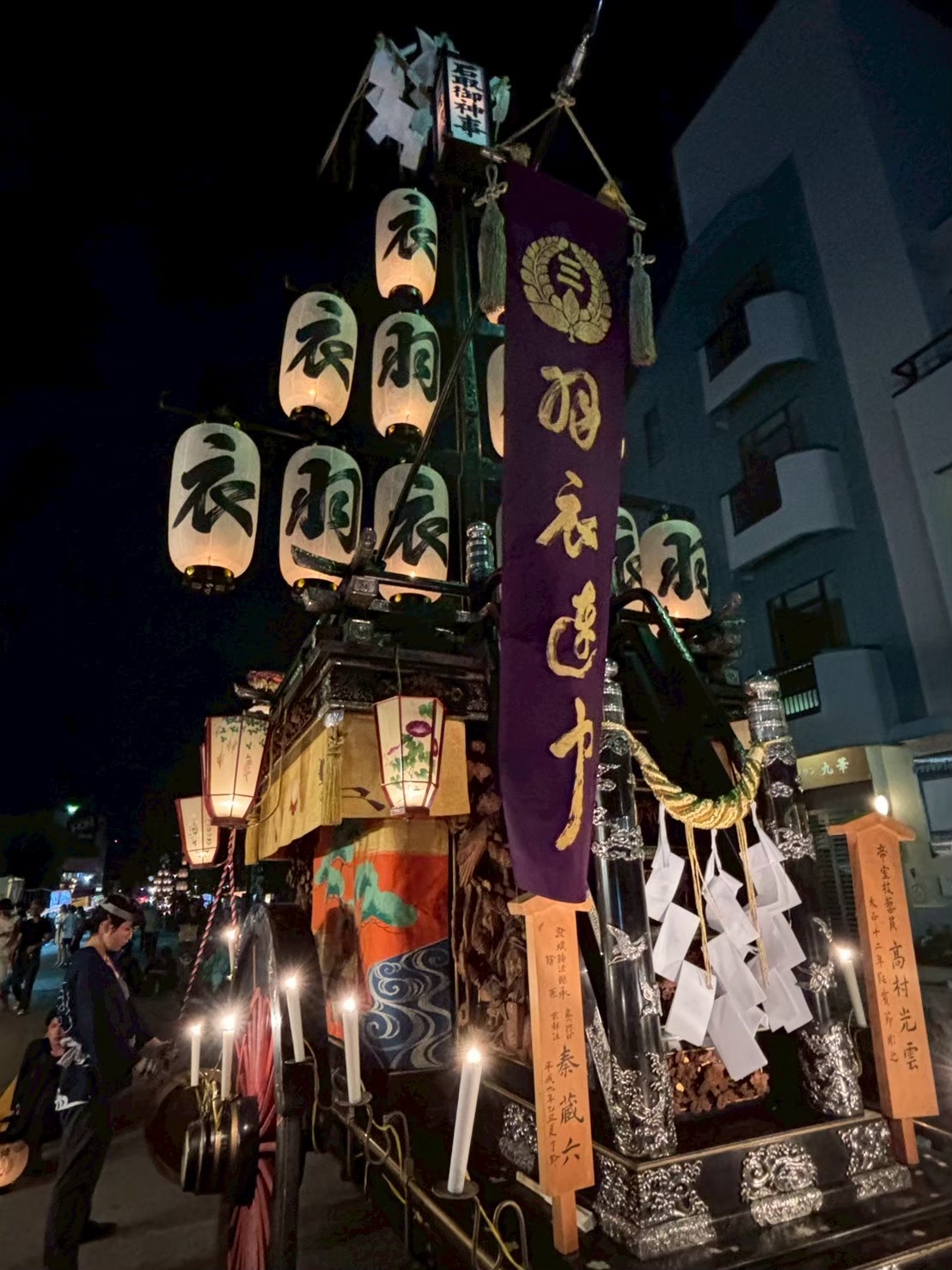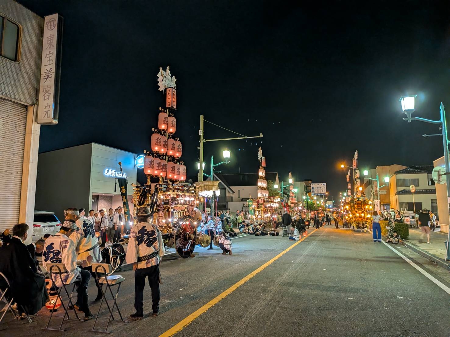 魚之棚通りでは第九組、第五組、第二組、第六組、第四組の祭車が両側に並びます。