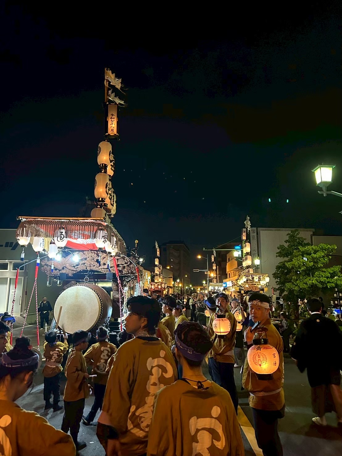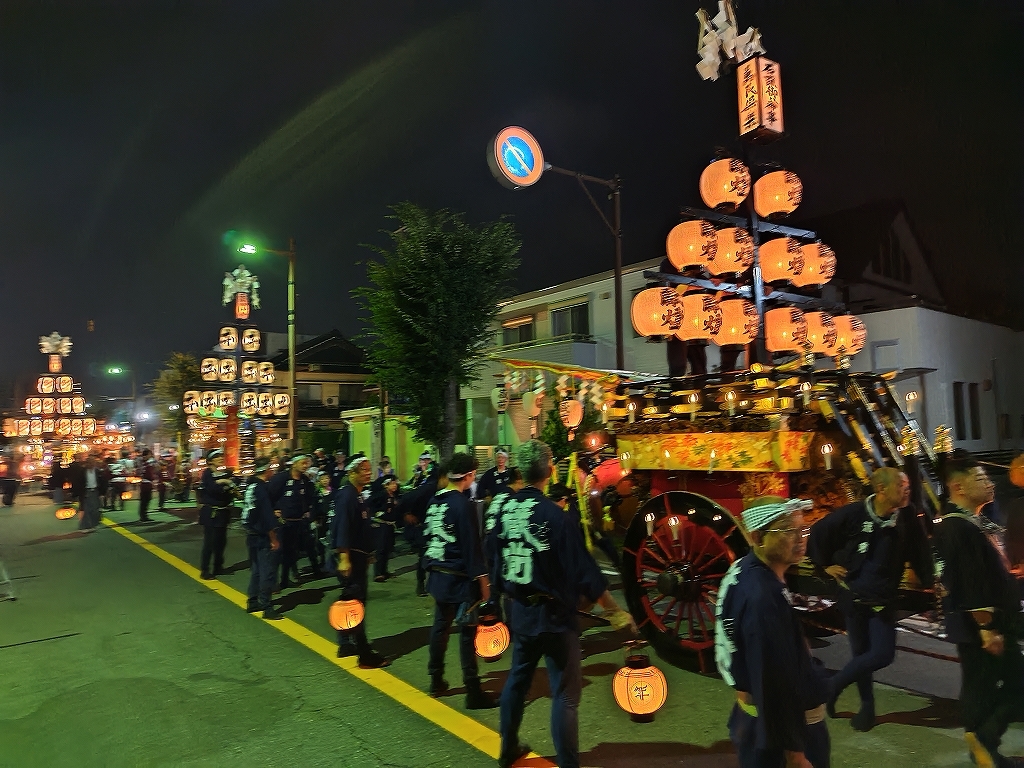 八間通り西側では、第十一組を先頭に第十組と第八組祭車が並びます。