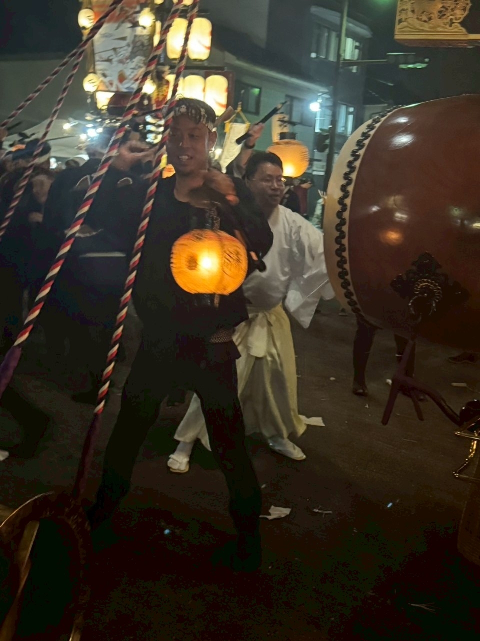 八間通り東側では、郵便ポスト前に第三組宮北祭車が止まります。