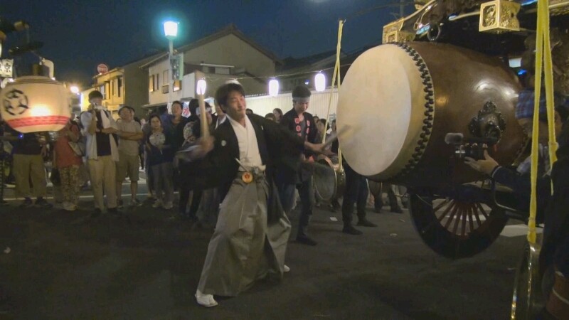 青年会長→副会長→会計→顧問→青年会員と順番に回し、途中に祭事長と副祭事長に叩いていただき、青年会から中老会へと続きます。
