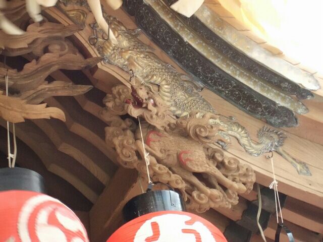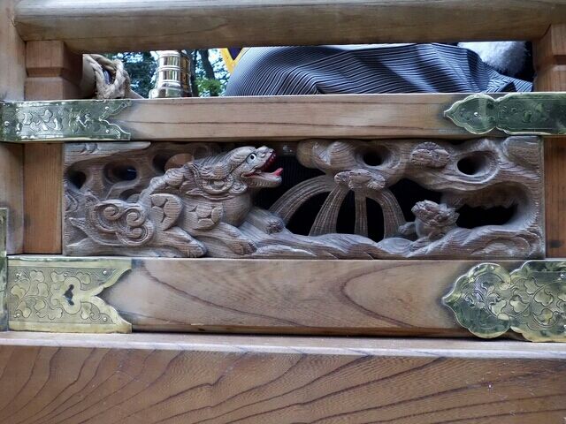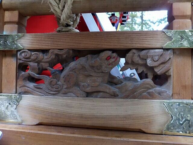 高欄合には唐獅子の彫刻など。