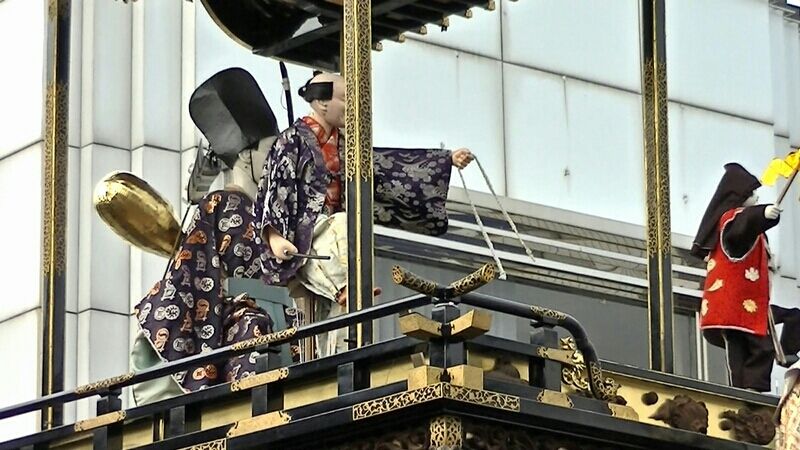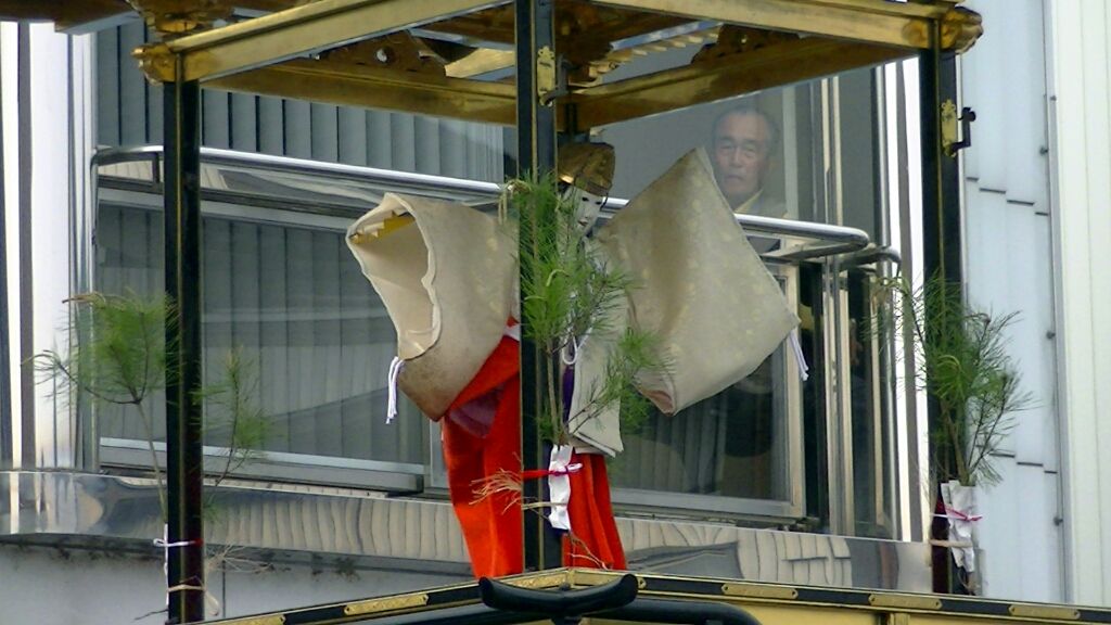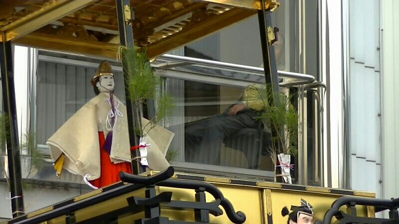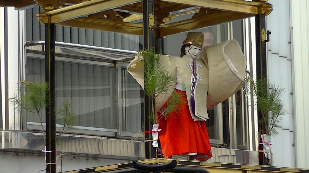 いきなり傾く山車に巫女人形も思わず、