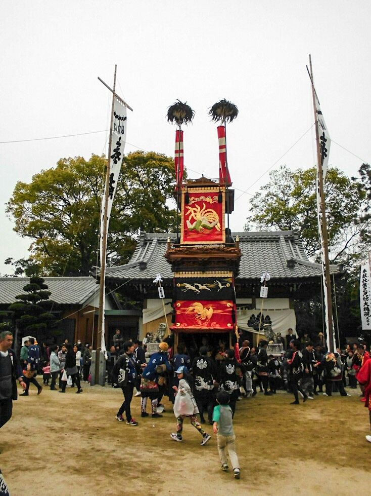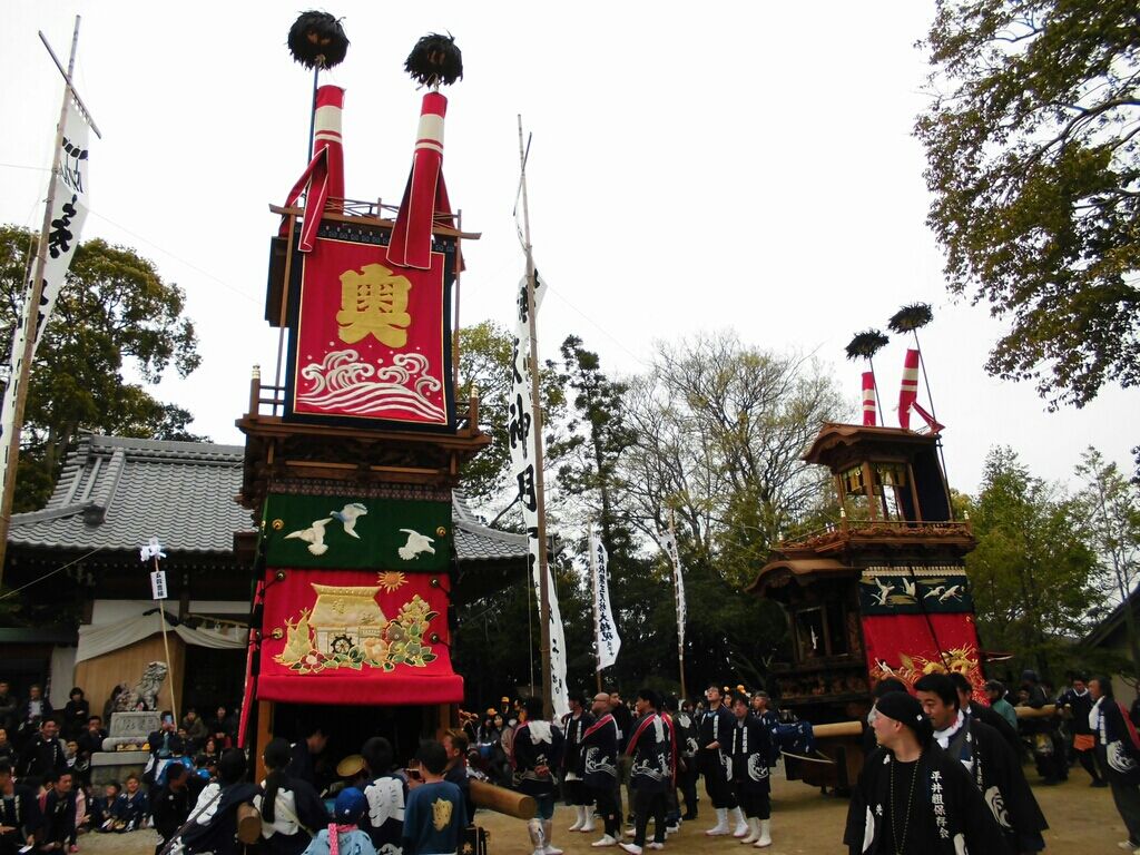 神明社の境内で、平井組 神明車が三番叟奉納をされています。