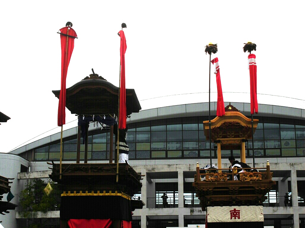 (からくりを演じるための大きな屋根を持つ上野間 北祭典部 越智嶋組と小型の屋根の奥田南組 南車)