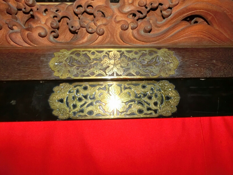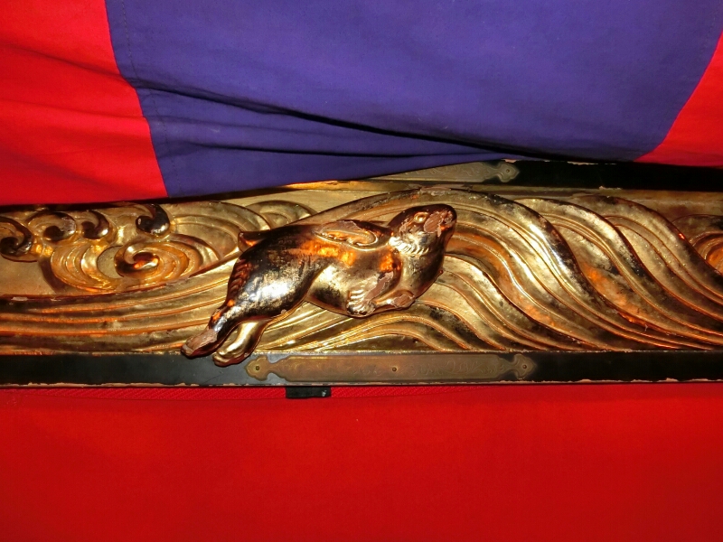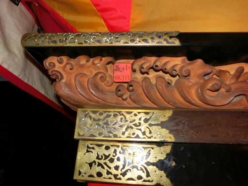 この山車は四日市祭(諏訪神社祭礼)のものが明治時代に売却(譲渡)されたものであるため、諏訪神社の神紋がいたるところについています。小川義休の銘がある写真の角の金具にも諏訪梶の半分が写っています。