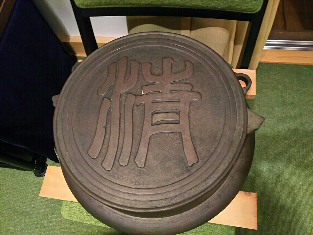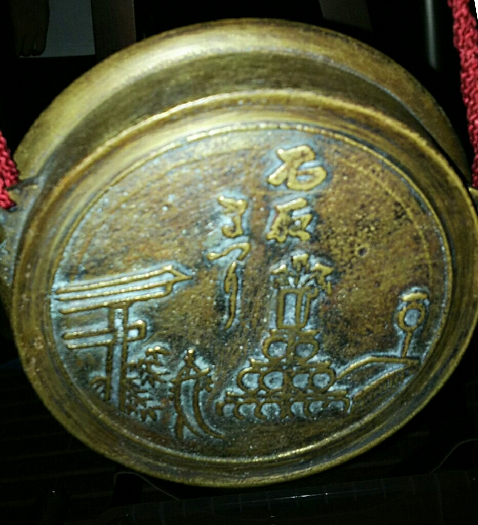 その昔、清水町が作った洋銀の鉦で、背に“清”の字が浮かぶもの。
