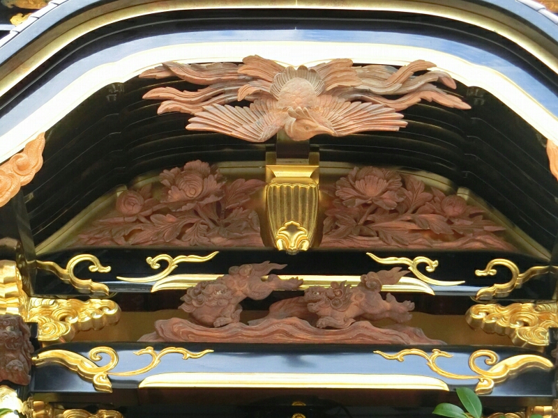太平鰭には牡丹、蟇股には唐獅子の彫刻が施され、意匠統一されています。