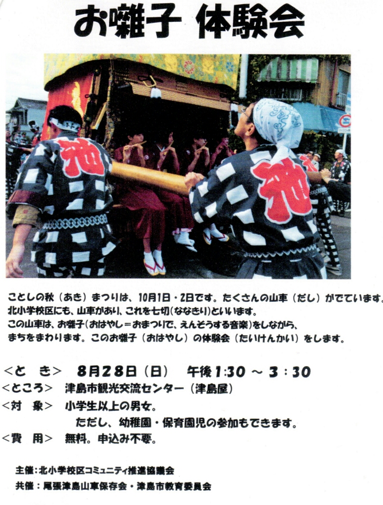 津島秋祭りの前に、お囃子体験会など色々な行事がありました。