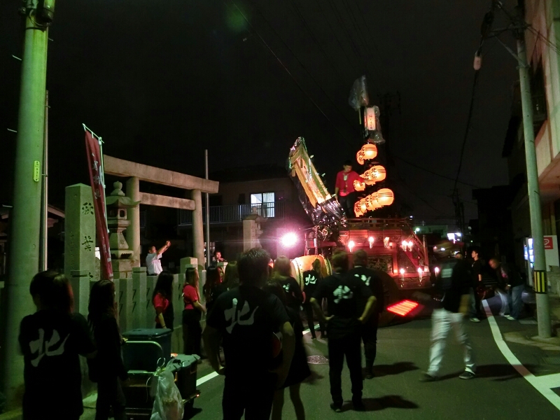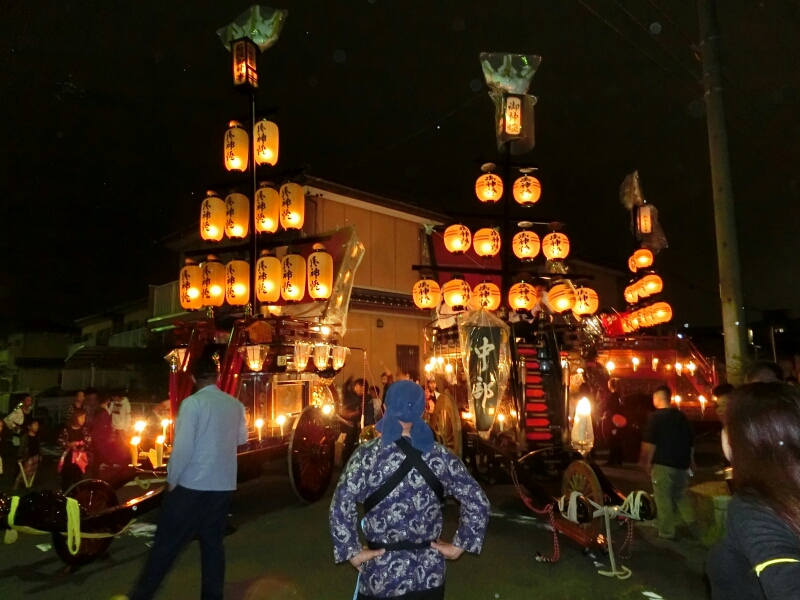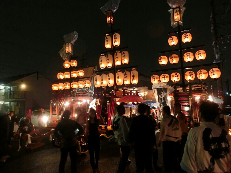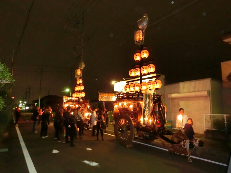 秋葉神社前に三台の祭車が並びます。