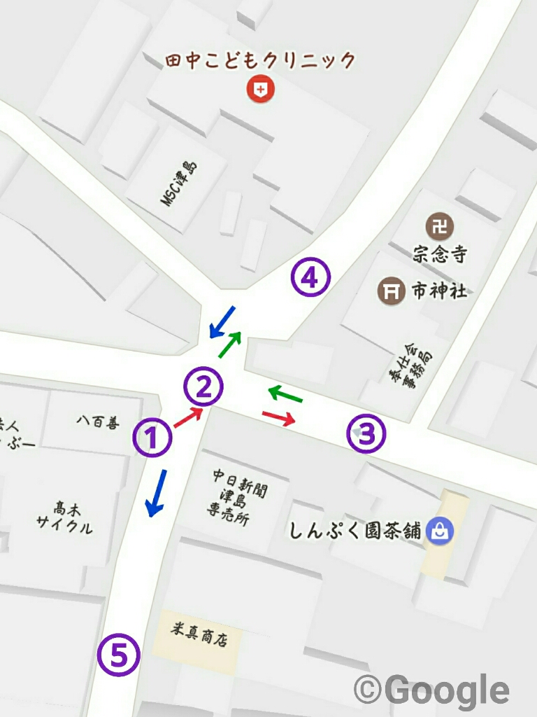 市神社の奉納が終わった山車は、②の交差点を右折し市神社西側(③→②→④)へ着けます。