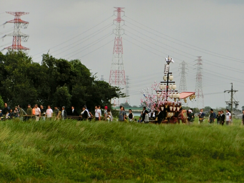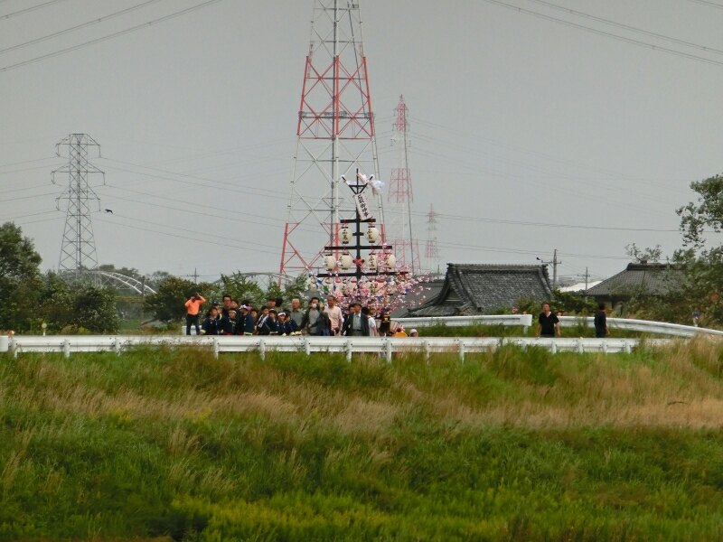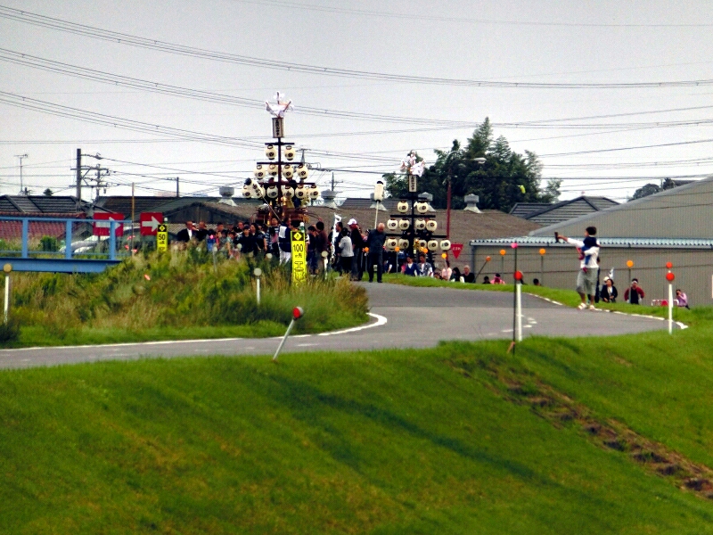 香取町の祭車2台が堤防に上がると、