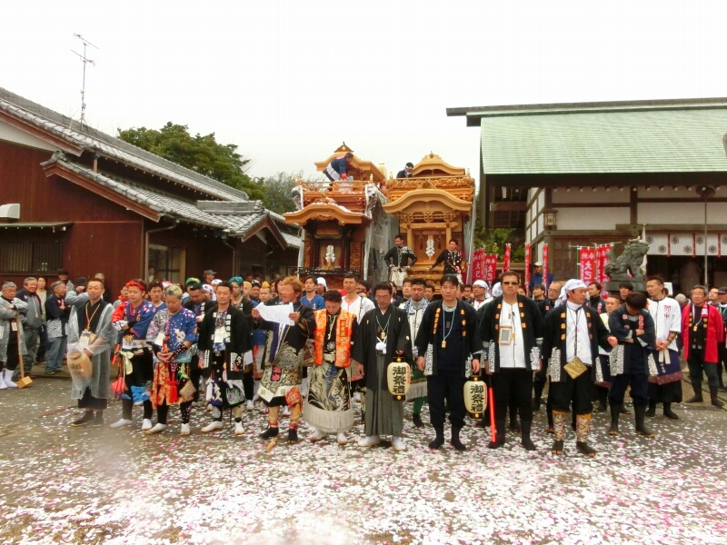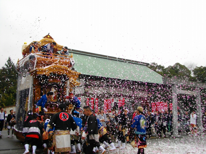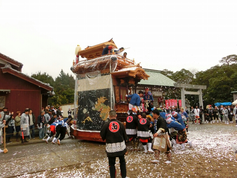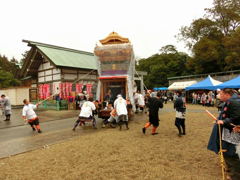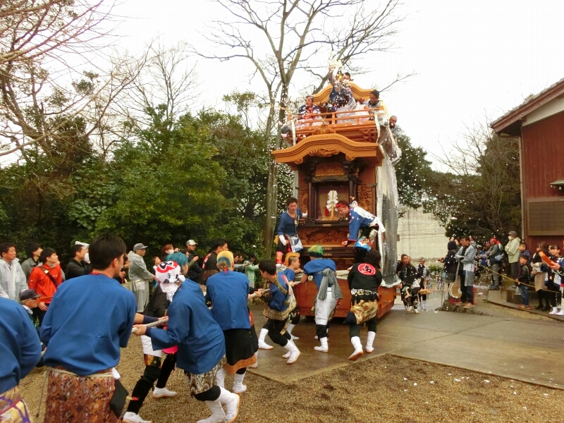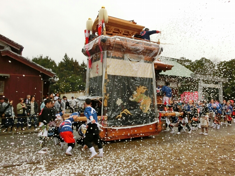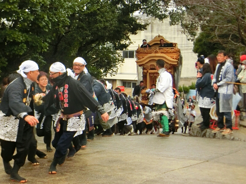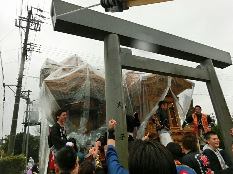 お囃子が山車を追い越し、鳥居前で競いあいます!