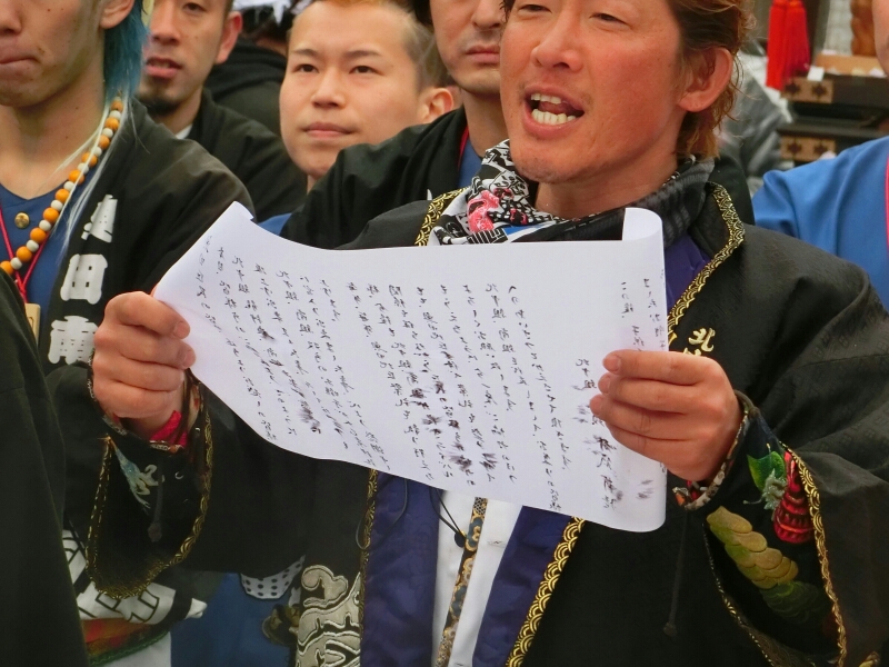 2台が揃ったところで、両組を代表して北中組組頭から挨拶が読み上げられました。