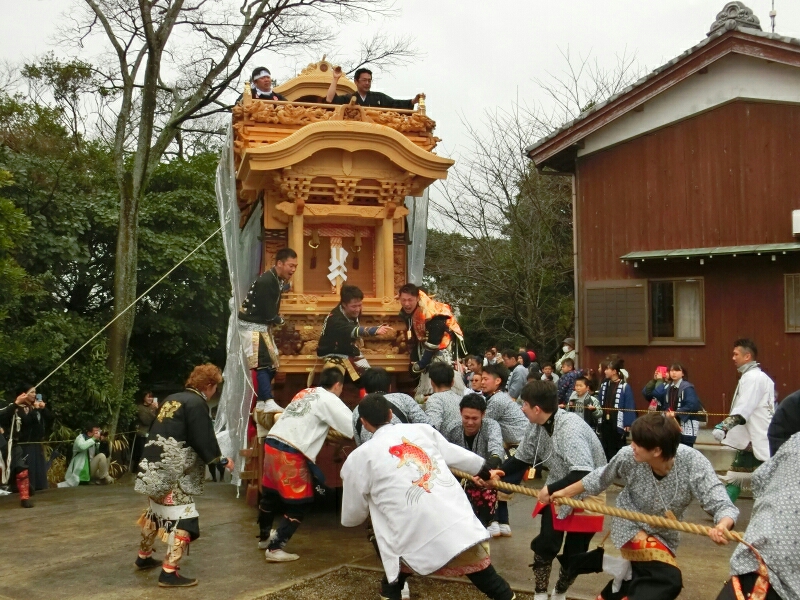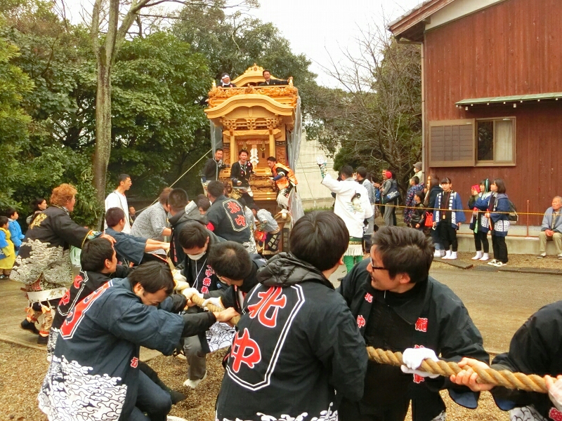 上半田南組より譲られた台輪に乗せ替えて挑む初めての坂上げのため、重くなったので安全面を考慮して綱先を真っ直ぐ境内へ曳き込みました。