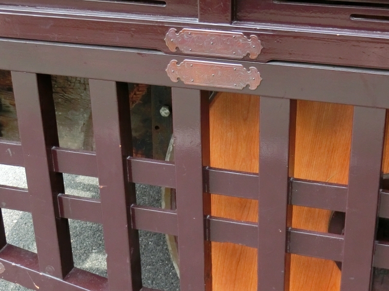 山車内部の部材には穴が数ヶ所開けられており、形状から昔の山車柱を転用したものと思われます。