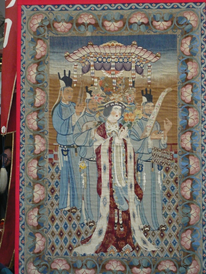 胴幕は沢宏靱下絵の雅楽器尽くしの綴織。