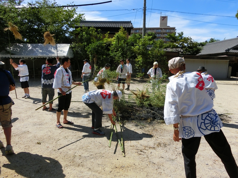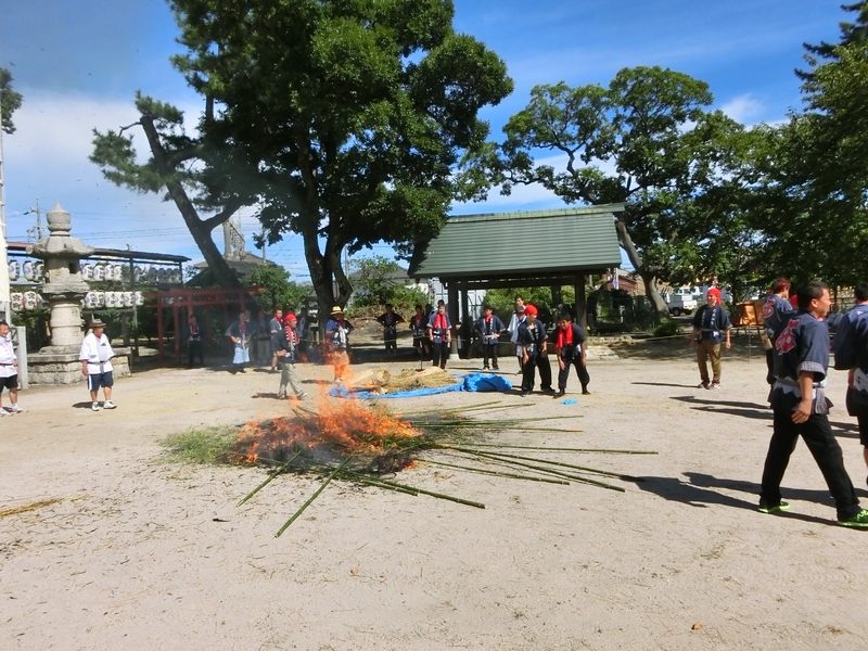 境内広場では持ってきた松明を並べます。